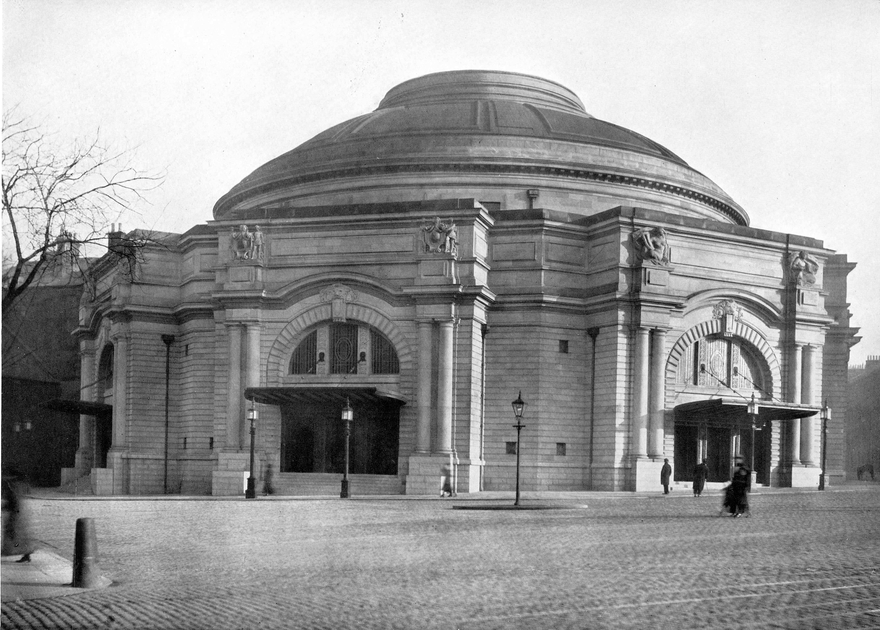 Three-storey Beaux Arts concert hall on wedge-shaped site, with polygonal entrance front and horseshoe-plan auditorium