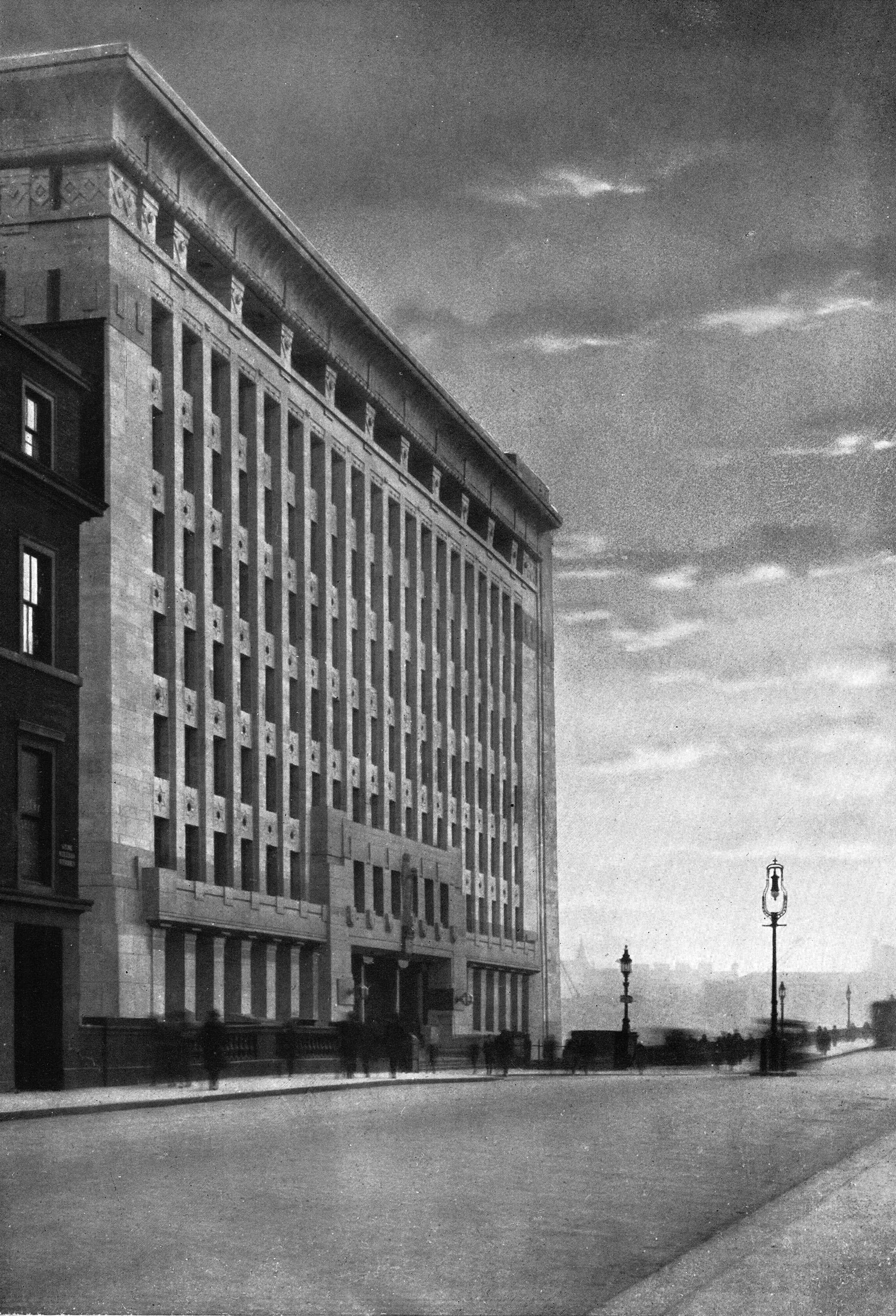 When completed in 1925 the building was the tallest in London, at 43m. It contains offices on nine floors above ground, with storage on two floors below ground, and a warehouse at one end for goods arriving from the river.