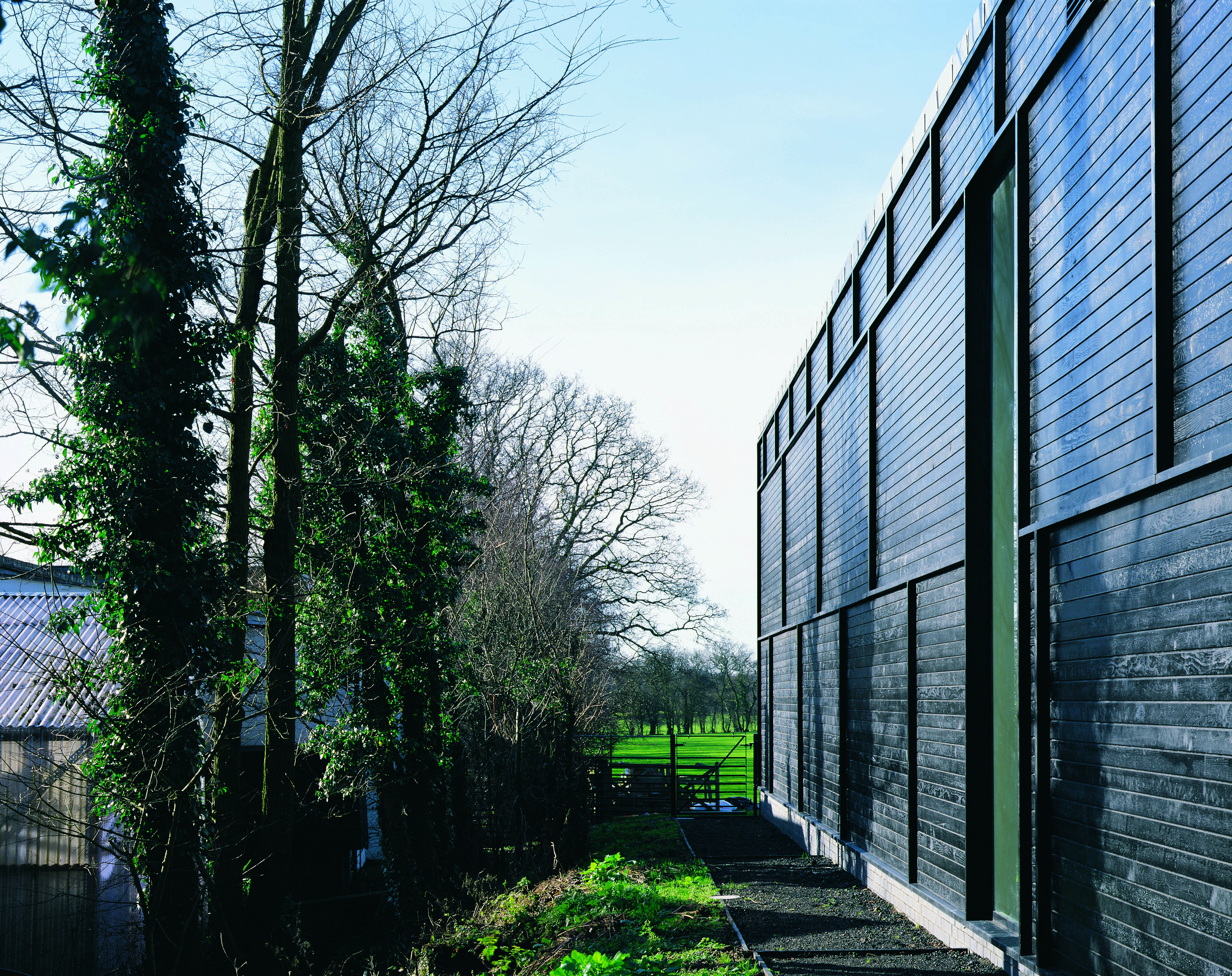 With a base of Staffordshire blue bricks, the elevations appear from a distance to be constructed from the black-stained weather-boarding. The simplicity of the interior means that it still feels like a barn. The zinc roof was selected for aesthetic reasons.