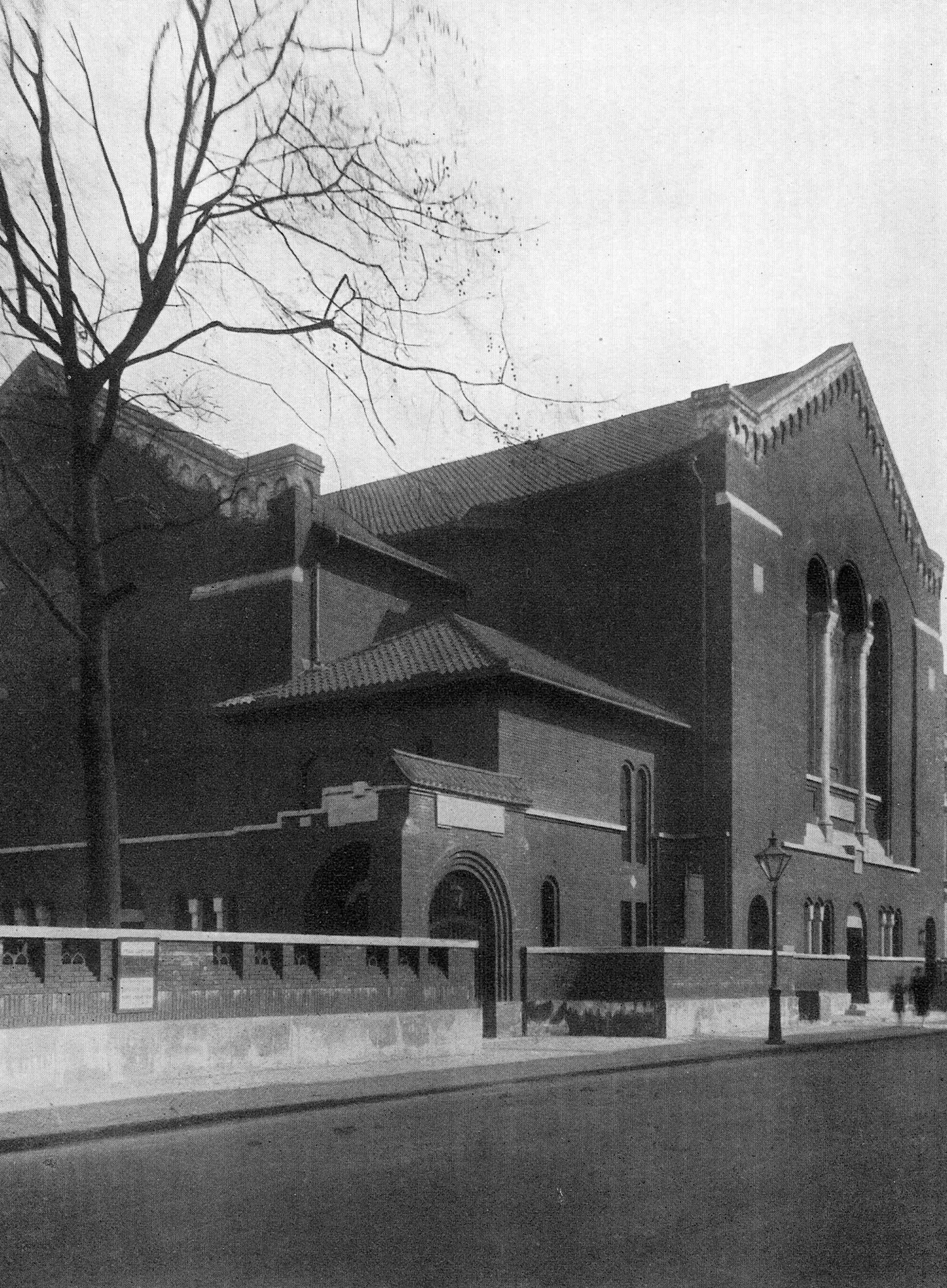 Outside the church lies a garden and beyond that, a Sunday school and the other facilities comprise an eastern wing. The brickwork design is carried on in these other buildings, and the garden also contains red brick paths and stone borders.