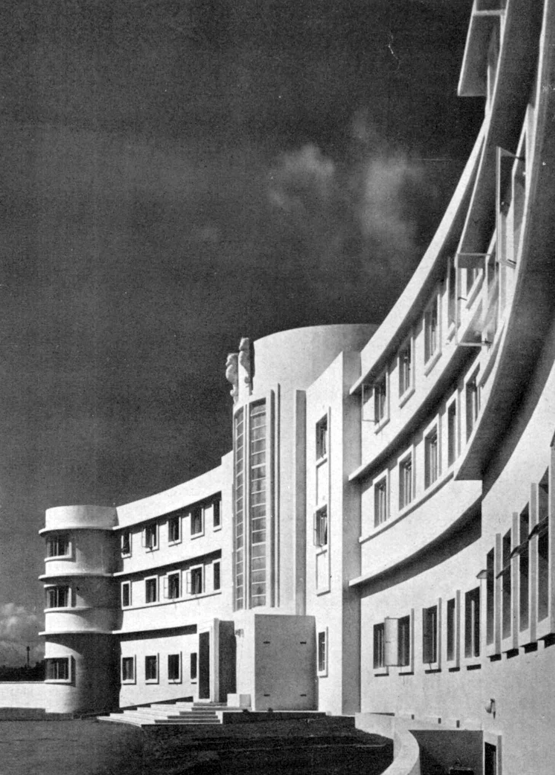 The general layout of the hotel has the main entrance and service portions on the concave side, enclosing the forecourt and facing the station, while the reception and guest rooms are on the convex side, overlooking the sea. The exterior is of glistening white rendering, composed of white cement and carborundum. All the soffits, undersides and projecting ledges are glazed blue green.