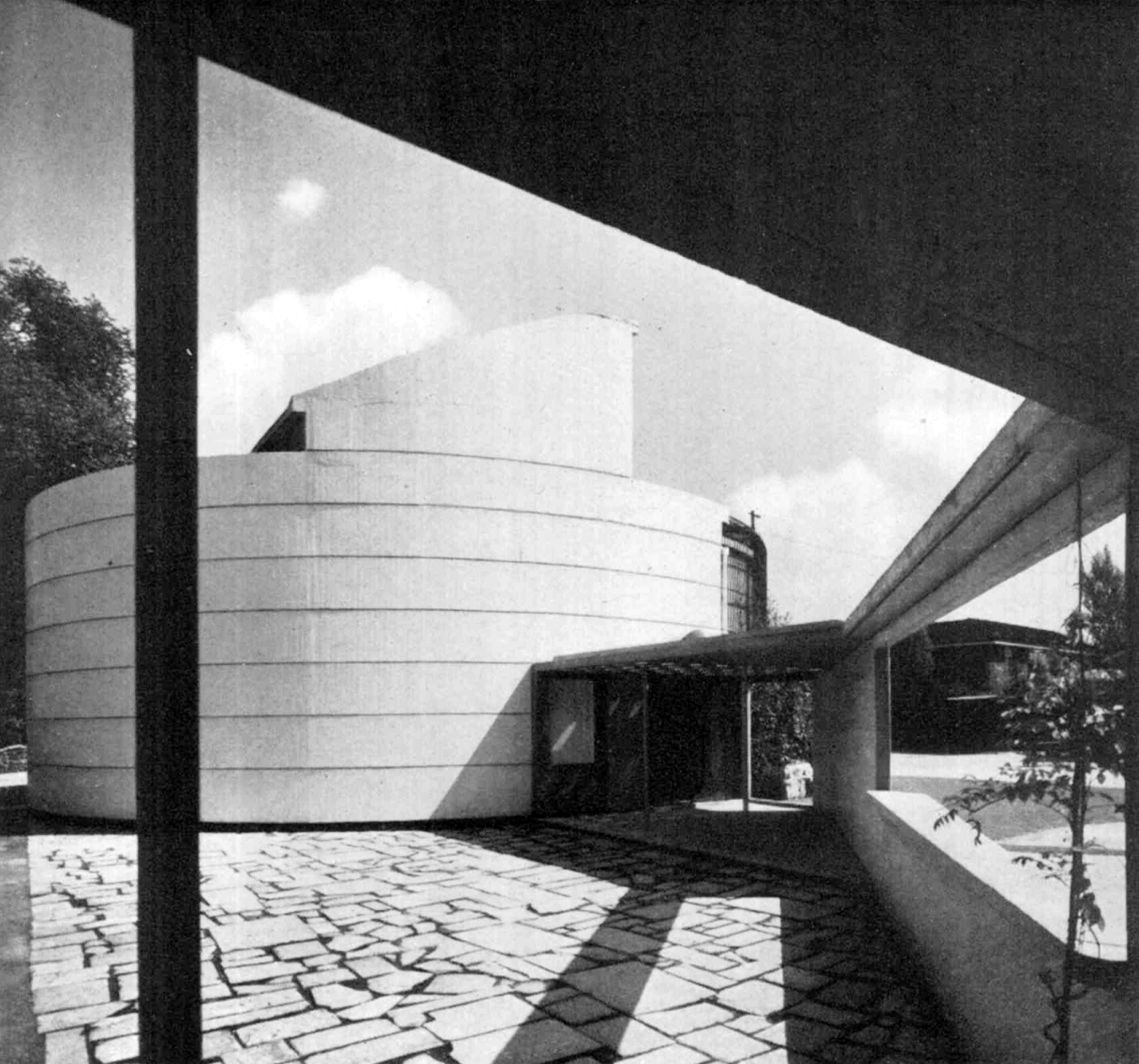 The revolving structure pivots centrally upon ball bearings on a solid steel column and is supported at its outer edge by fifteen rollers moving along a steel channel running completely around the top of the building, while the wall hangs from the roof. The main structure is reinforced concrete and since no rendering has been used, deep grooves run along its surface in horizontal bands.