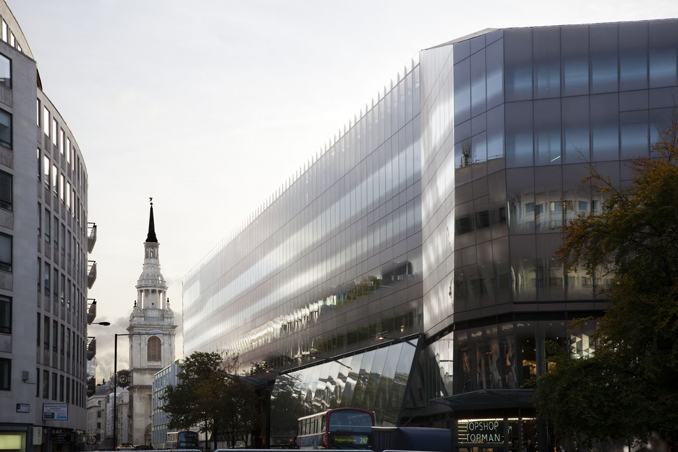 The elevation on Cheapside is more than 100m long. It’s façade consists of 4,300 uniquely shaped glass panels, each with a minutely detailed frit. Other materials used in the project include limestone, shiny metals, and mirrors.