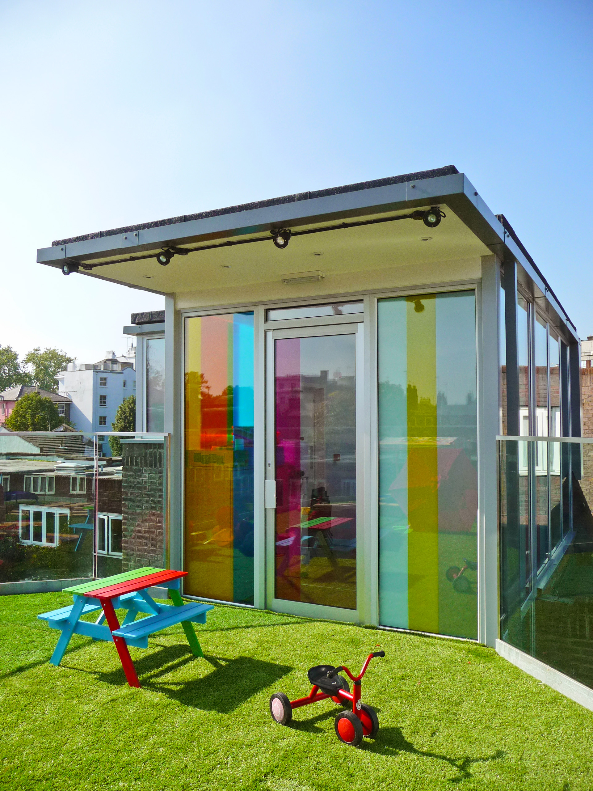 he idea of creating a rooftop playspace was conceived along with making additional space as a mezzanine within the upper room. A striped coloured glass construction was designed to provide a bridge to the new mezzanine, and house a new stair to the rooftop playspace .