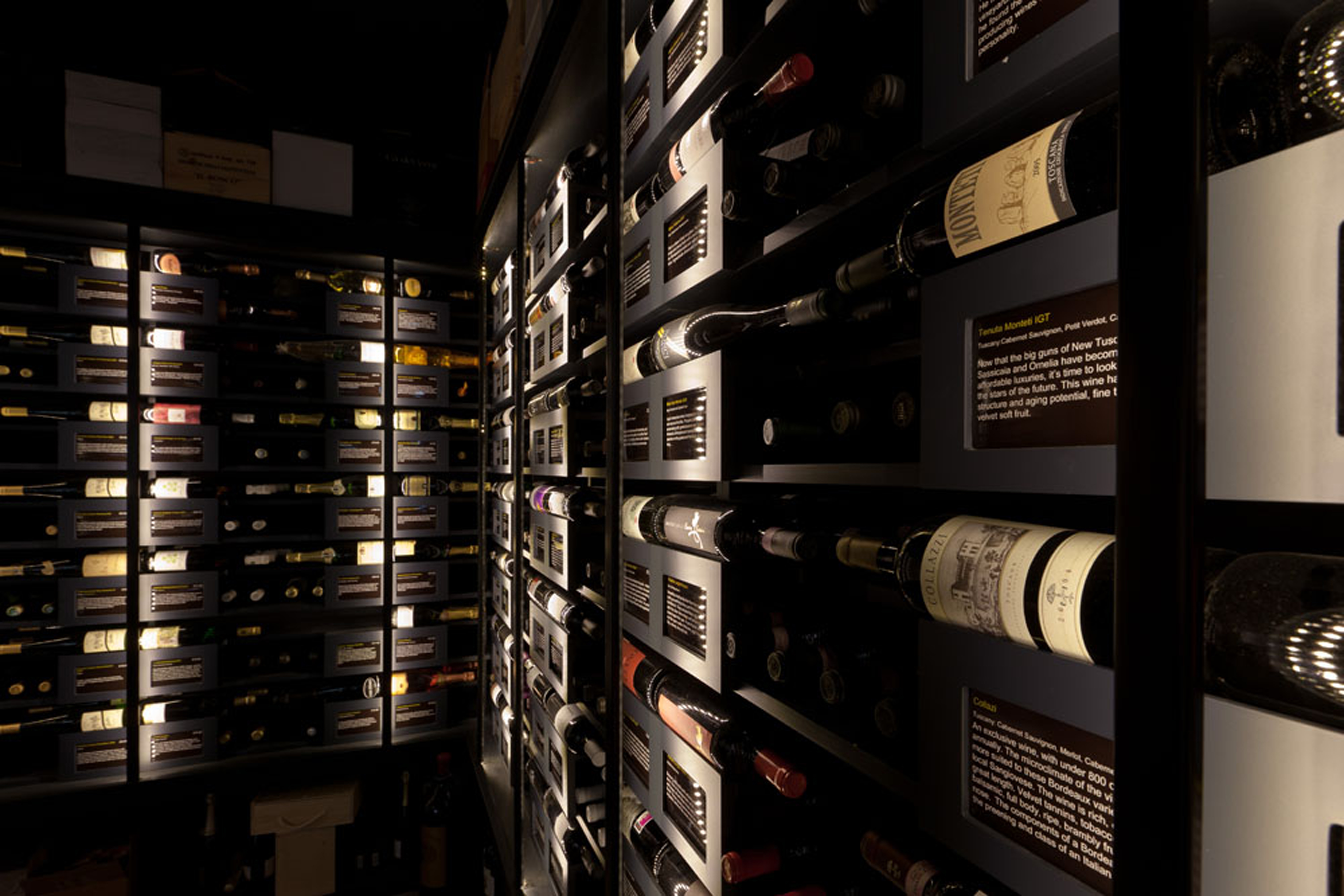A modular storage shelving system allows each individual component to create both storage and display. These repeated unit form storage walls, lining the shop. Concealed LEDs pick out the bottle labels from the dark matt shelving.