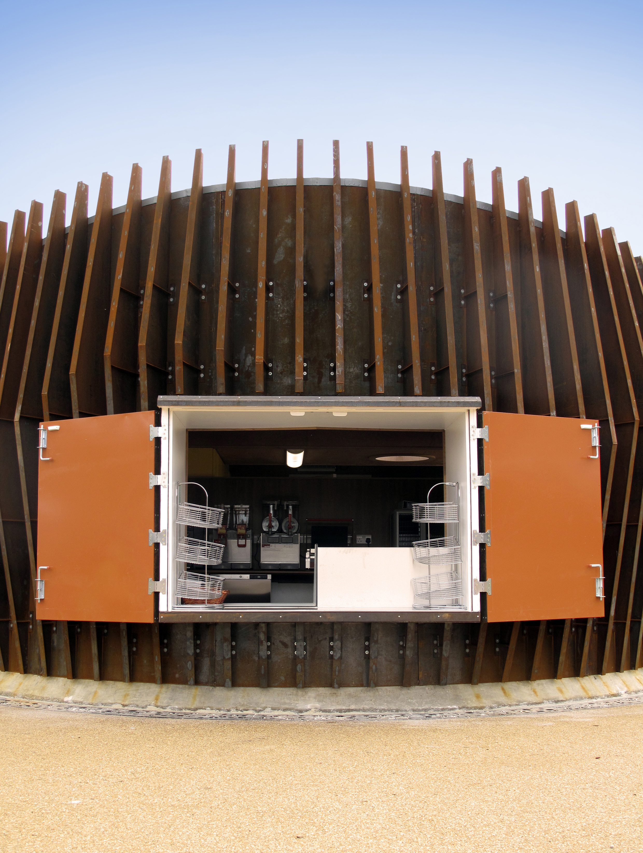 Weathering steel is used to express the materiality of the pavilion: durable and vandal proof, its rust-like appearance of autumnal tones fits well with the park setting and honours the steel tradition of Scunthorpe. The fins were guillotine cut and spot welded before being assembled on site.