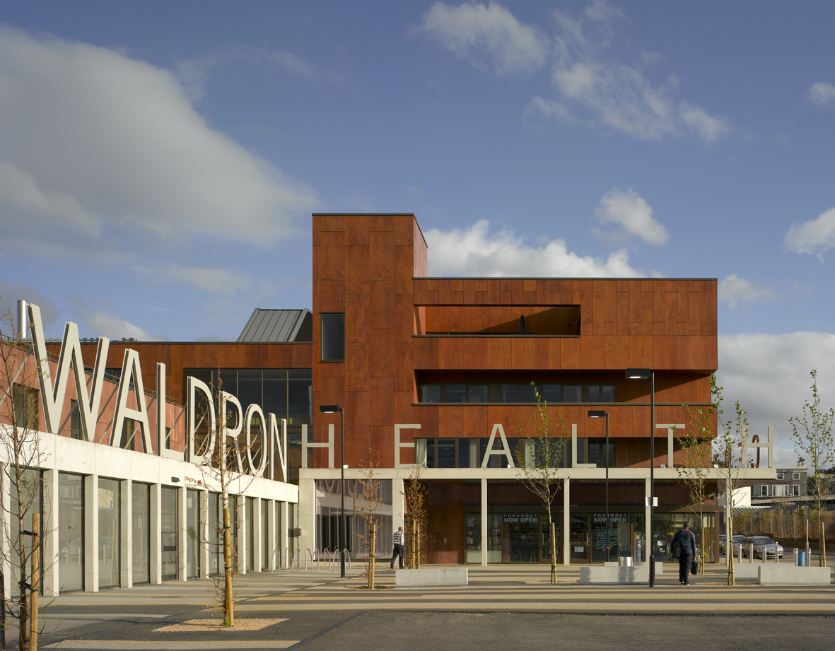 The square and west façade are framed by a canopy, concrete arcade and screen, which provide a counterpoint in scale and material to the building mass. On the canopy are storey high graphics reading: WALDRON, HEALTH and CENTRE. Seen together they constitute a sign, but seen apart they become part of the composition of each elevation and help form the character of the whole development.