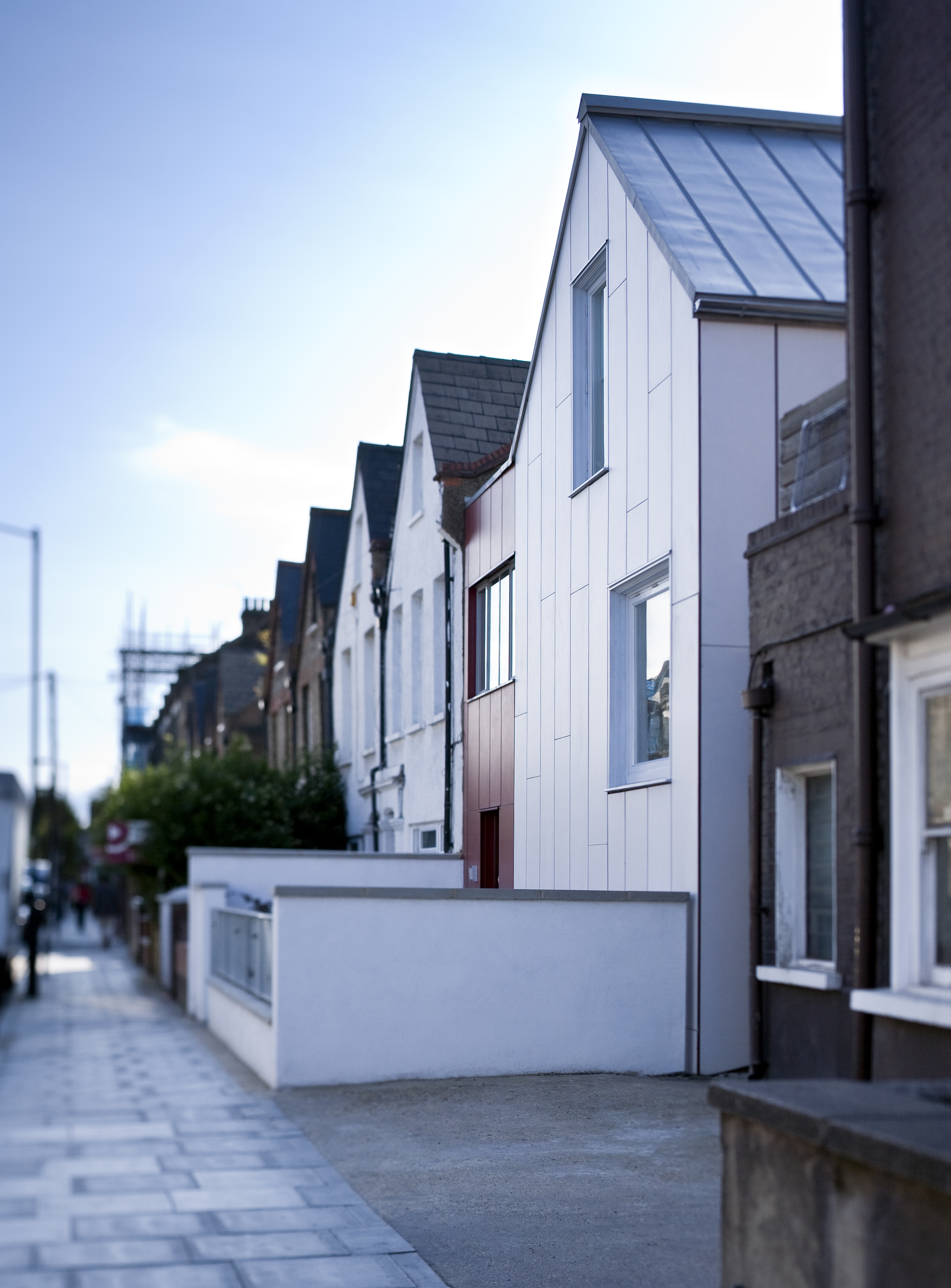 Construction was simple; reinforced block basement walls, concrete block walls and joisted floors and roof. Insulation is external behind a rainscreen of cement fibre panels in red and white, the colours of Arsenal football club, (Highbury stadium is on the same road). The roof is zinc-standing seam. Internally the house is painted plaster with oak floors and staircase.