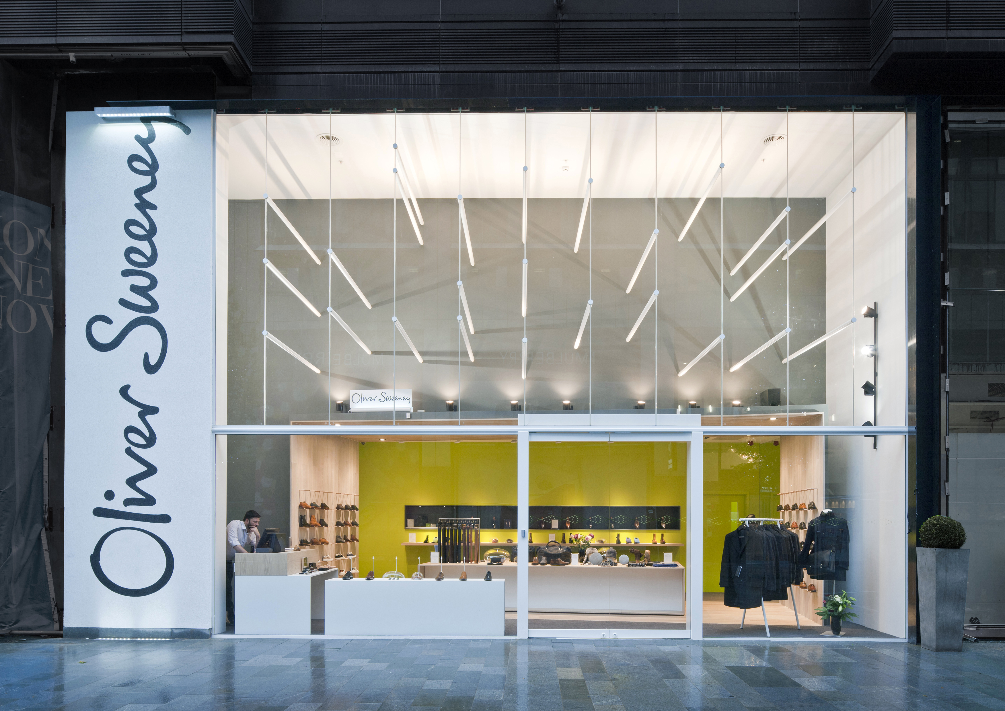 Inside, an independent geometrical timber box forms the main sales area. An oak and rubber peg system is used to display shoes. A central monolithic wooden element displays product and provides customer seating. Shoes and accessories are displayed under bespoke glass blown domes.