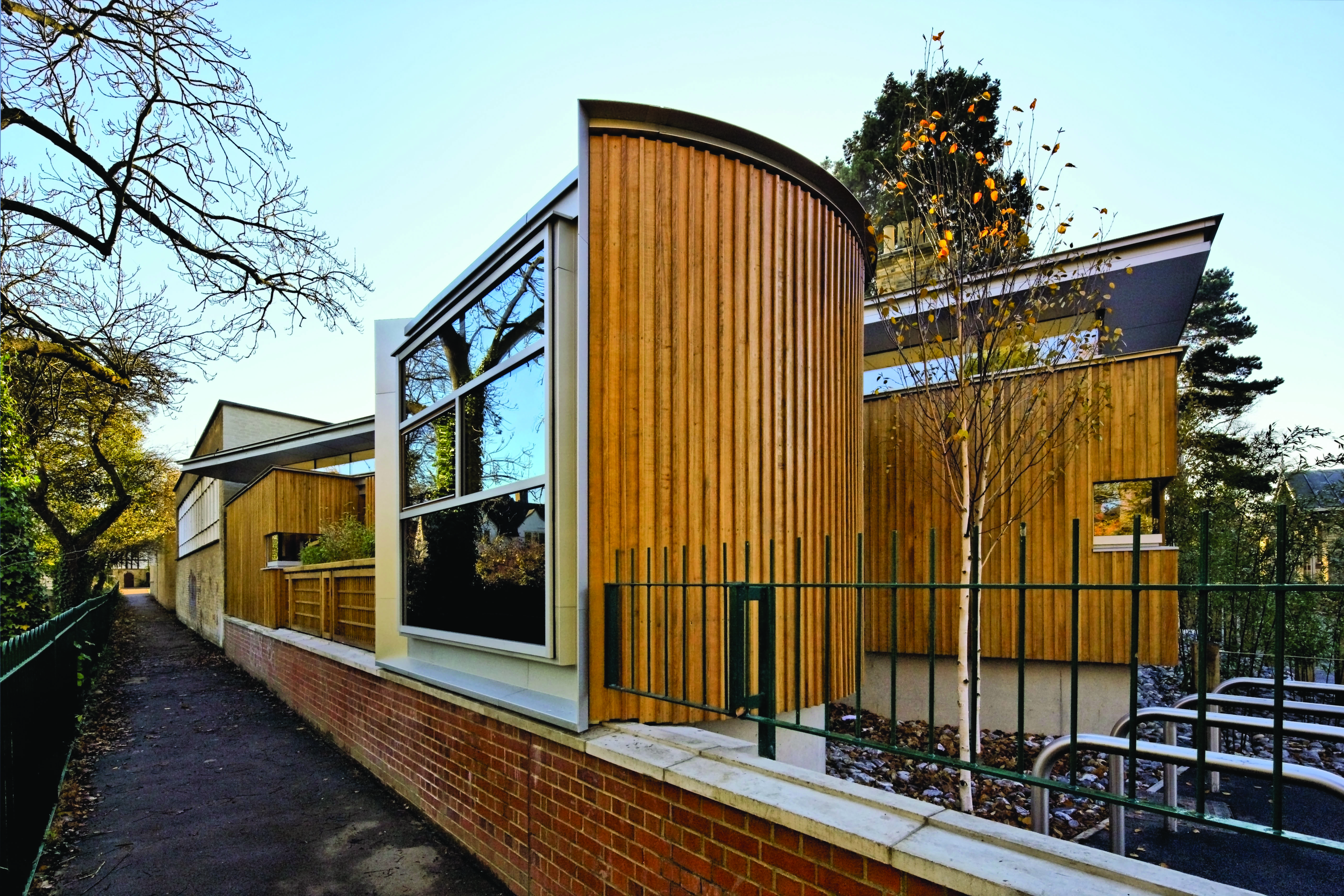 The facility is housed within a single storey extension to an existing Victorian Grade II listed pool keeper’s lodge, which sits by the river Chelt. The extension, clad and lined in locally sourced hardwood and conceived as a series of highly detailed pieces of ‘furniture’, sits under a large winged roof.