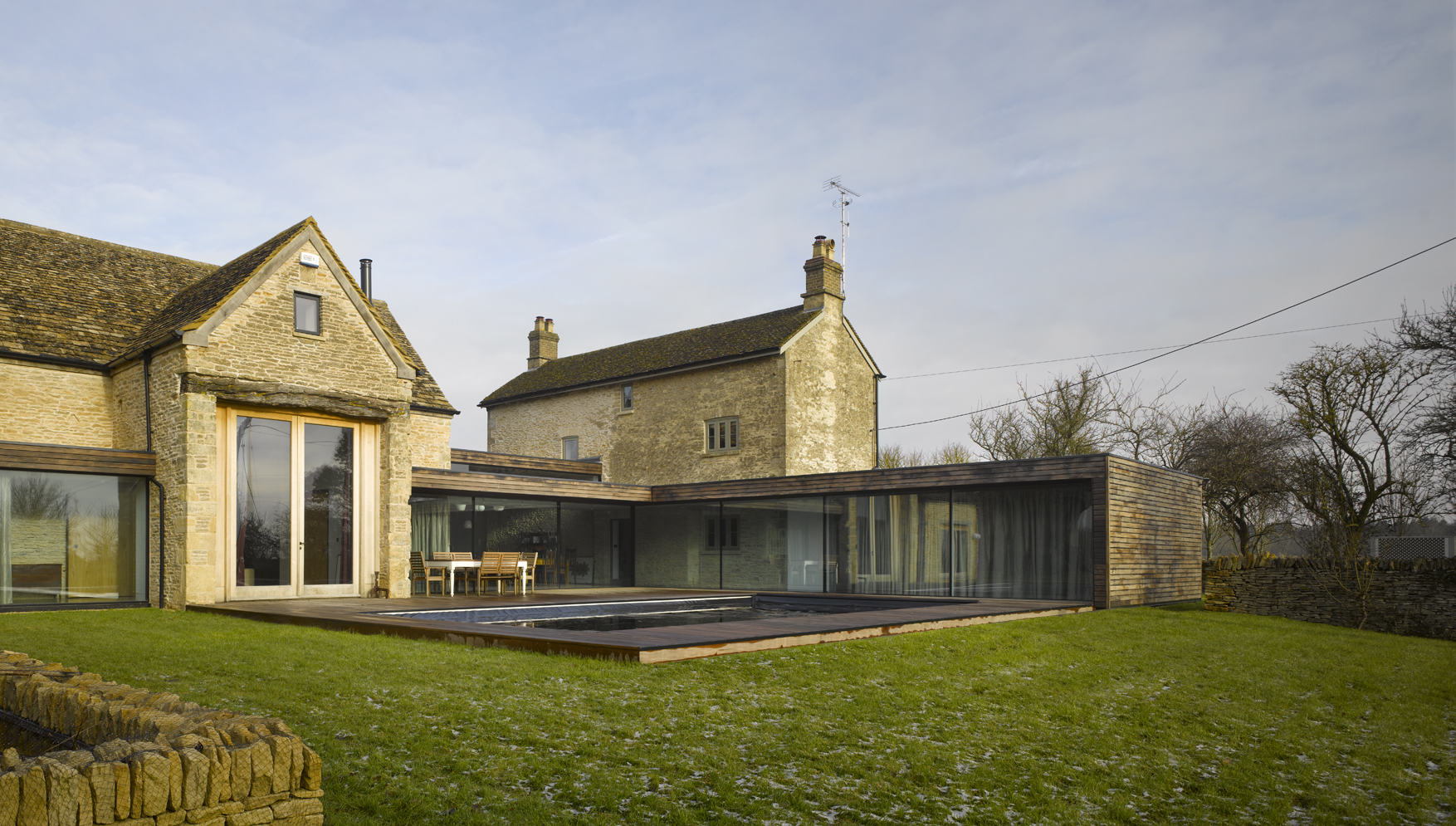 The Victorian farmhouse is a three-storey structure created from Cotswold stone. The refurbishment aims to retain the traditional feel of country living and provide enough space for children. A single-storey new-build timber and glass building links the farmhouse to the barn enclosing two sides of the garden and housing an open-plan kitchen, dining area and a new guest suite.