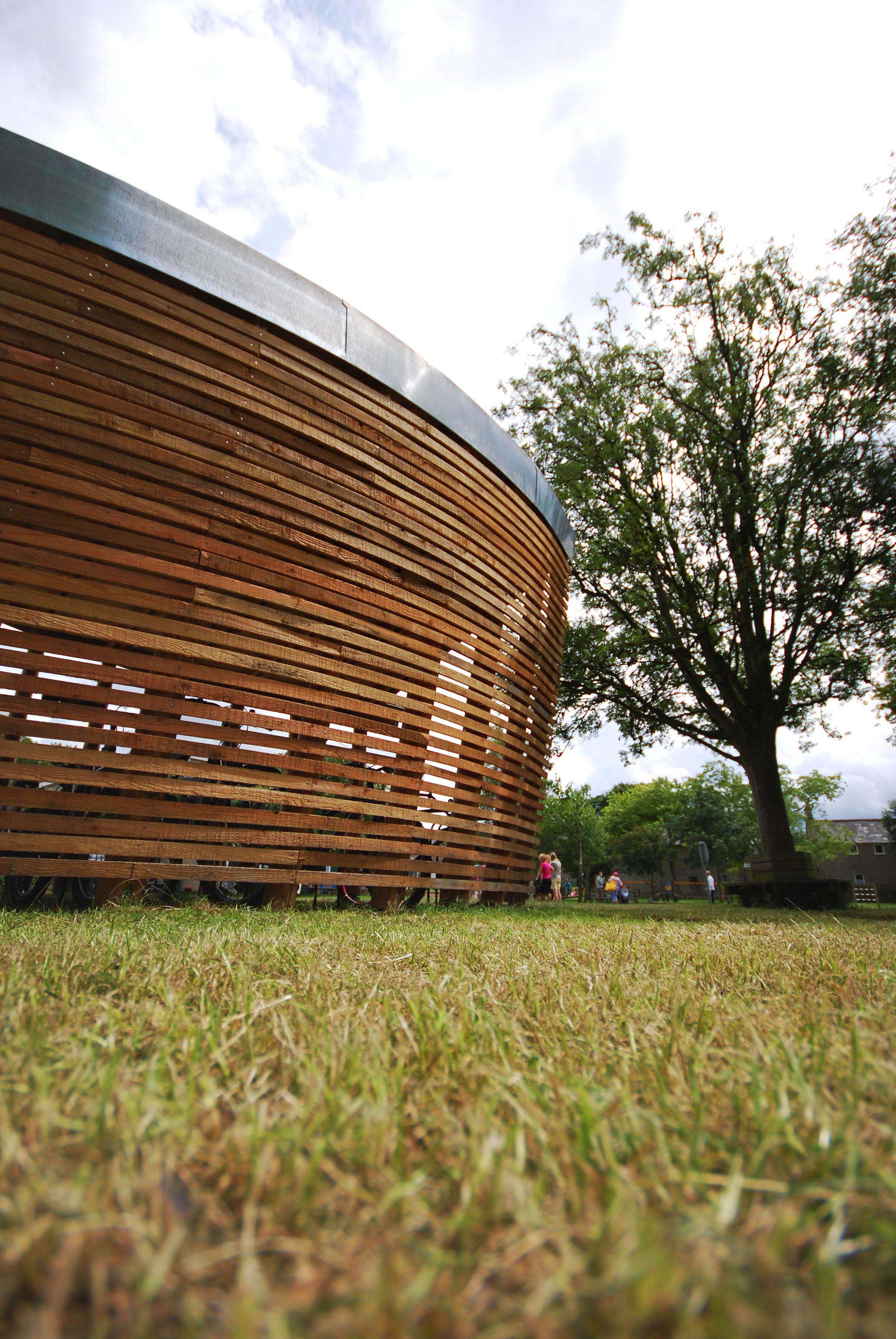 The battened side of the enclosure faces into the prevailing wind, in the same manner as local barns. Similarly, the ‘low’ points of the roof are designed with an understanding of prevailing wind patterns, ensuring that the bikes inside stay dry.