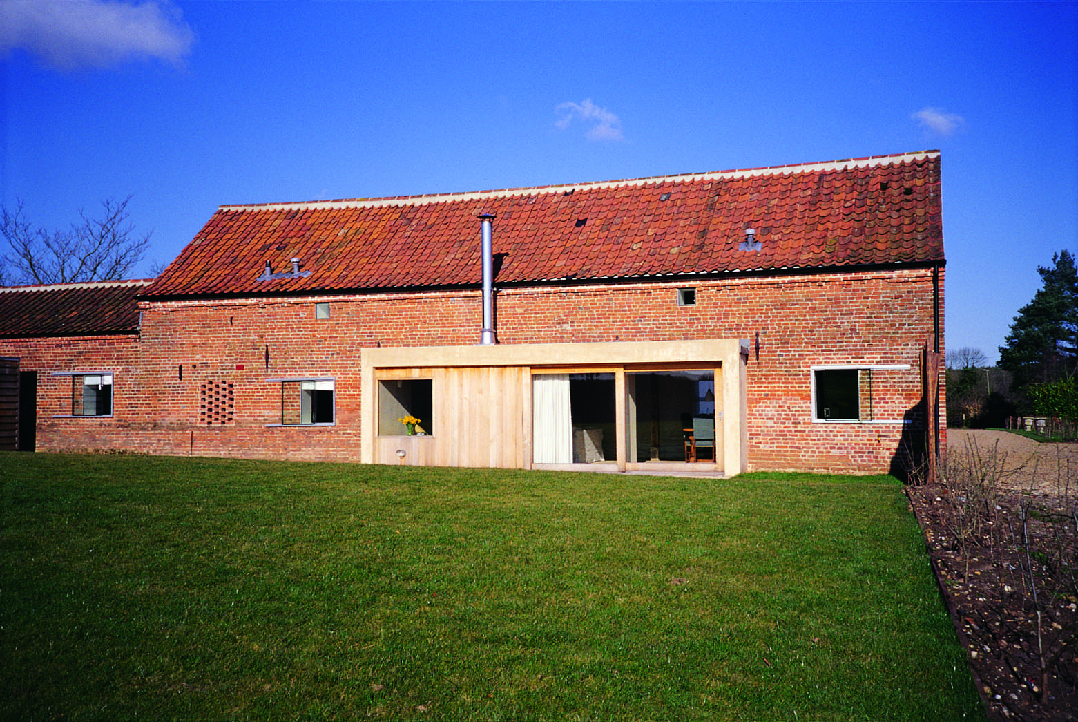 The new north wall of larger barn, which overlooks the courtyard, is made of straw bales faced with a rainscreen of translucent glass fibre panels, a wall which gives high levels of thermal insulation.