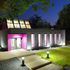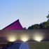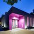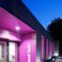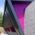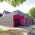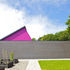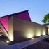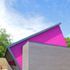 Where the entrance, windows and roof spaces are carved from the rectangular form a flash of magenta contrasts with the brick facade.