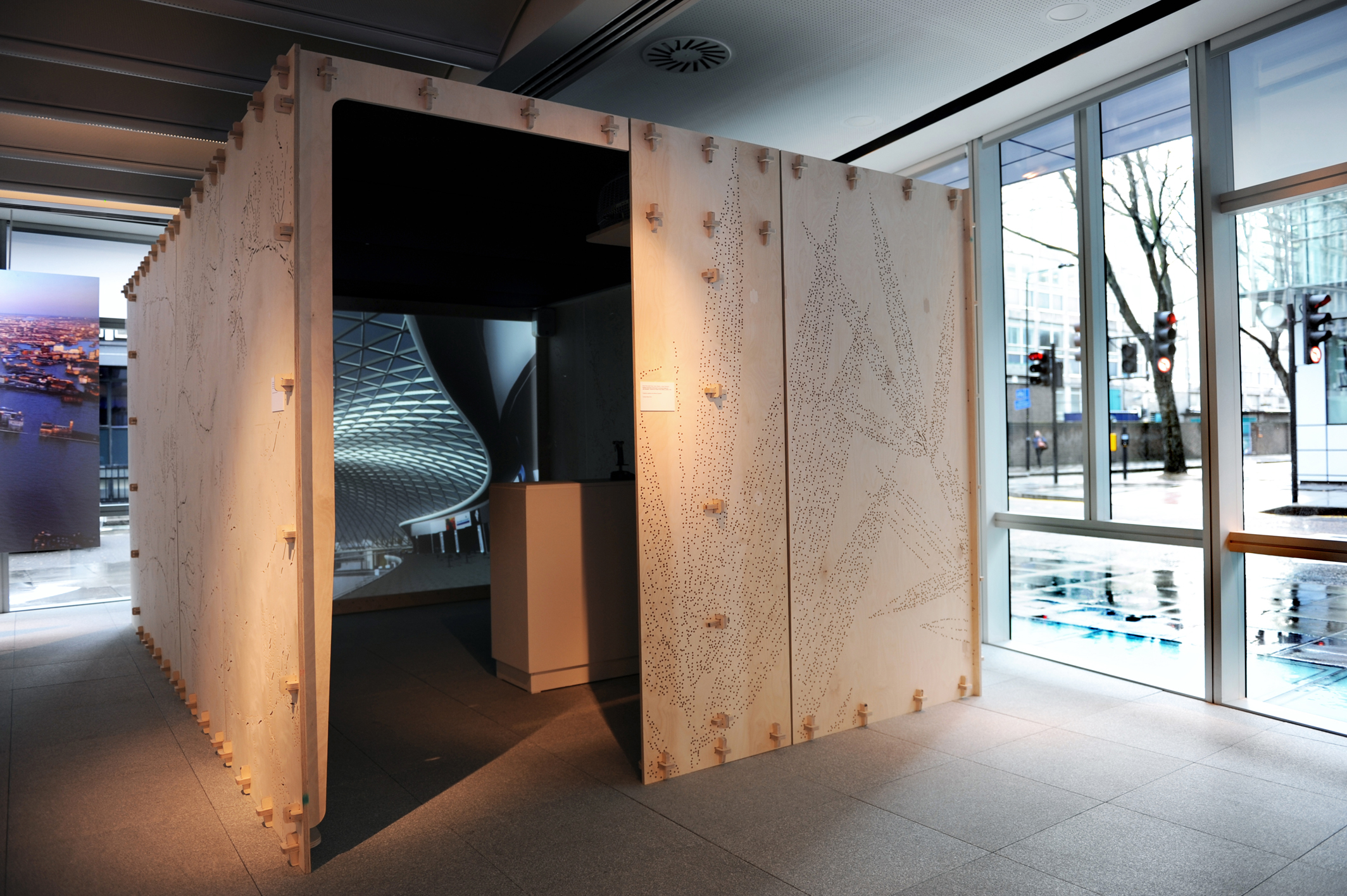 The perforated patterns on the panels are inspired by the botanical illustrations of Anne Rudge, wife of the botanist and antiquary Edward Rudge (1763-1846) who lived and worked on the site Arup's offices now occupy. Subsequently the interactive display plinth was collaboratively developed and constructed with Kin Design and Onedotzero Industries.
