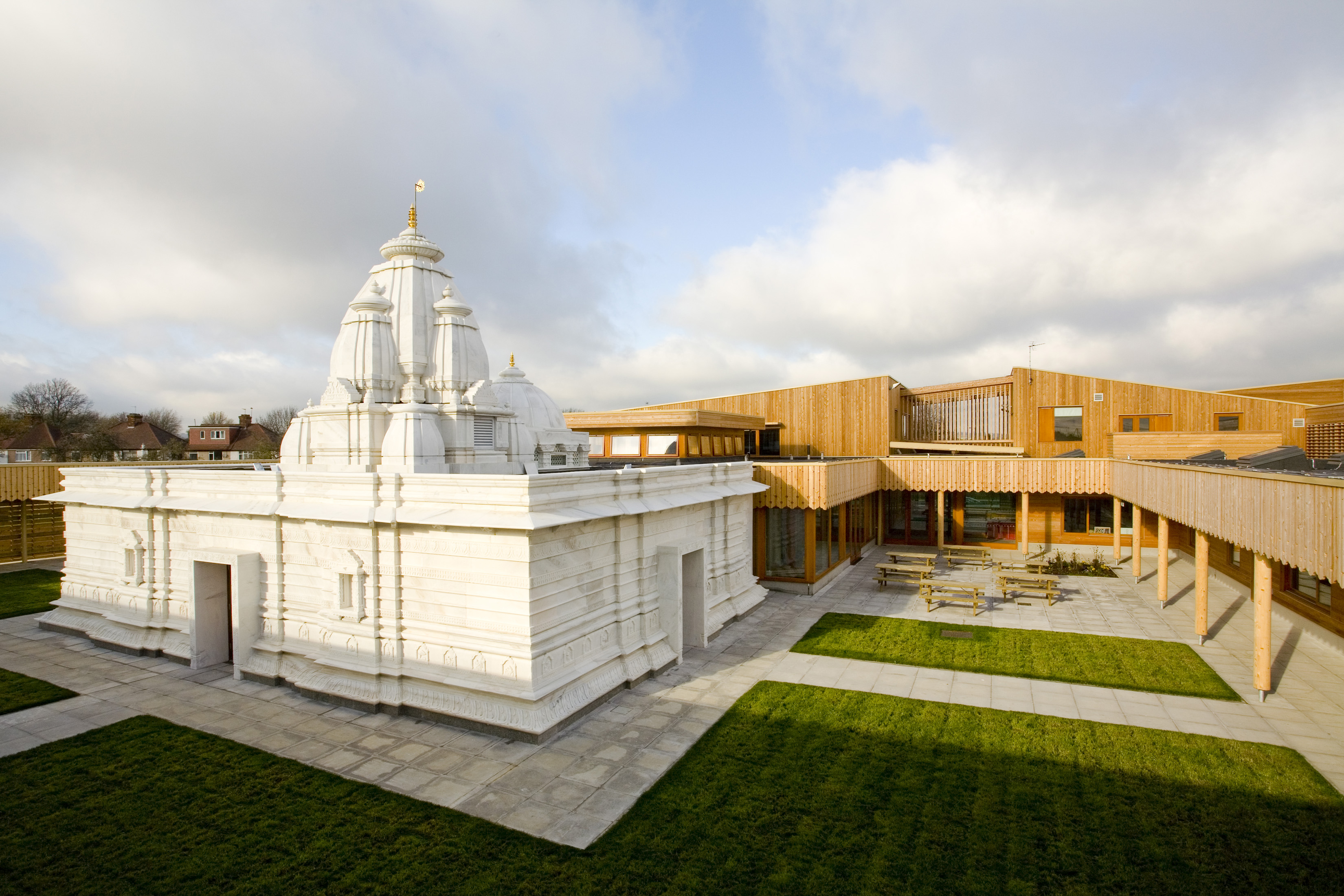 A Hindu temple built in traditional Vedic style sits in a courtyard at the centre of the school surrounded by an open colonnade. This temple, constructed from white carved marble, is visible from all of the public spaces in the building, including the music and drama space and the spiritual japa garden.