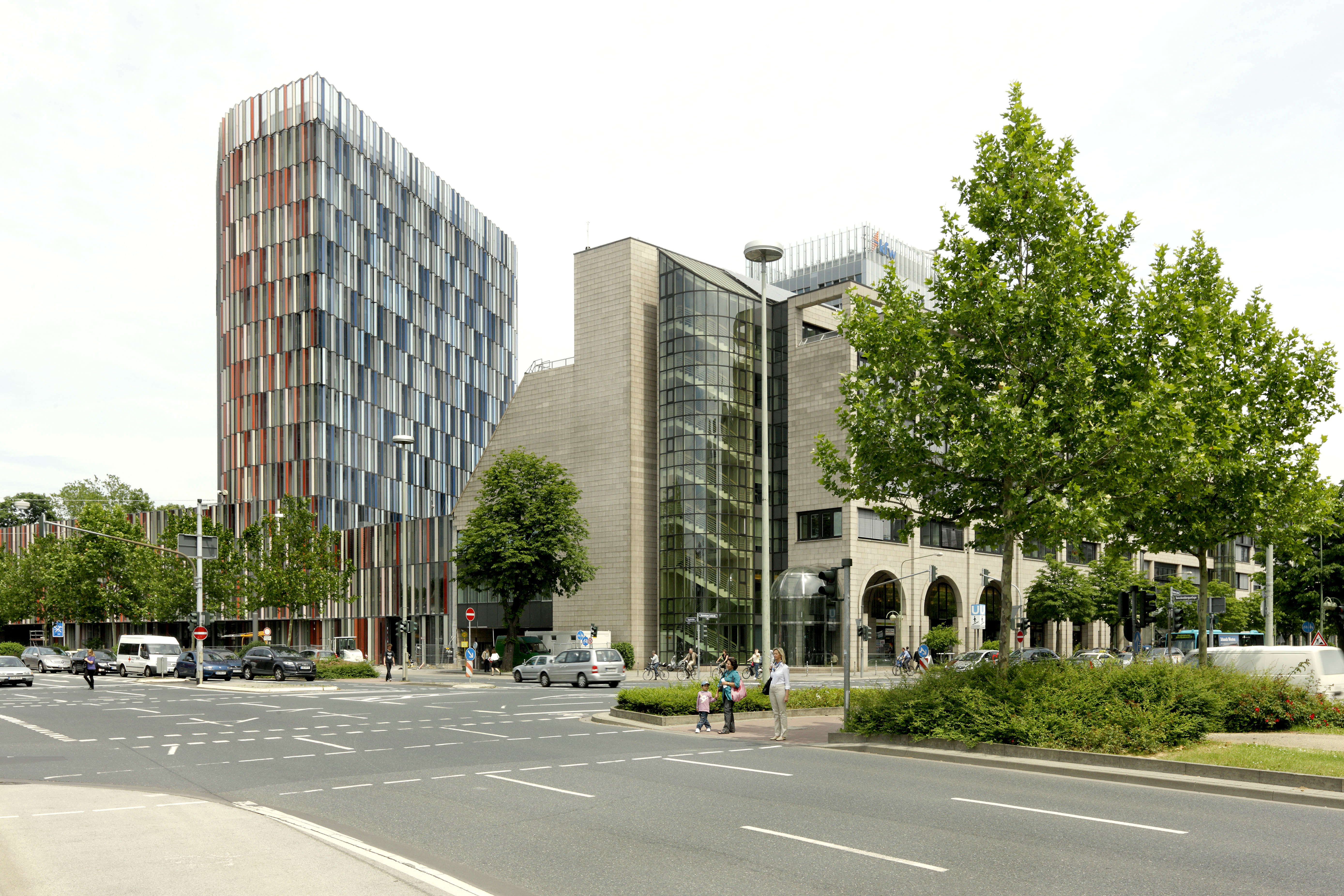 The high-rise stands between two distinct urban spaces, it appears as a slim slab towards the street and presents a discreet backdrop to the landscape of the Palmengarten.