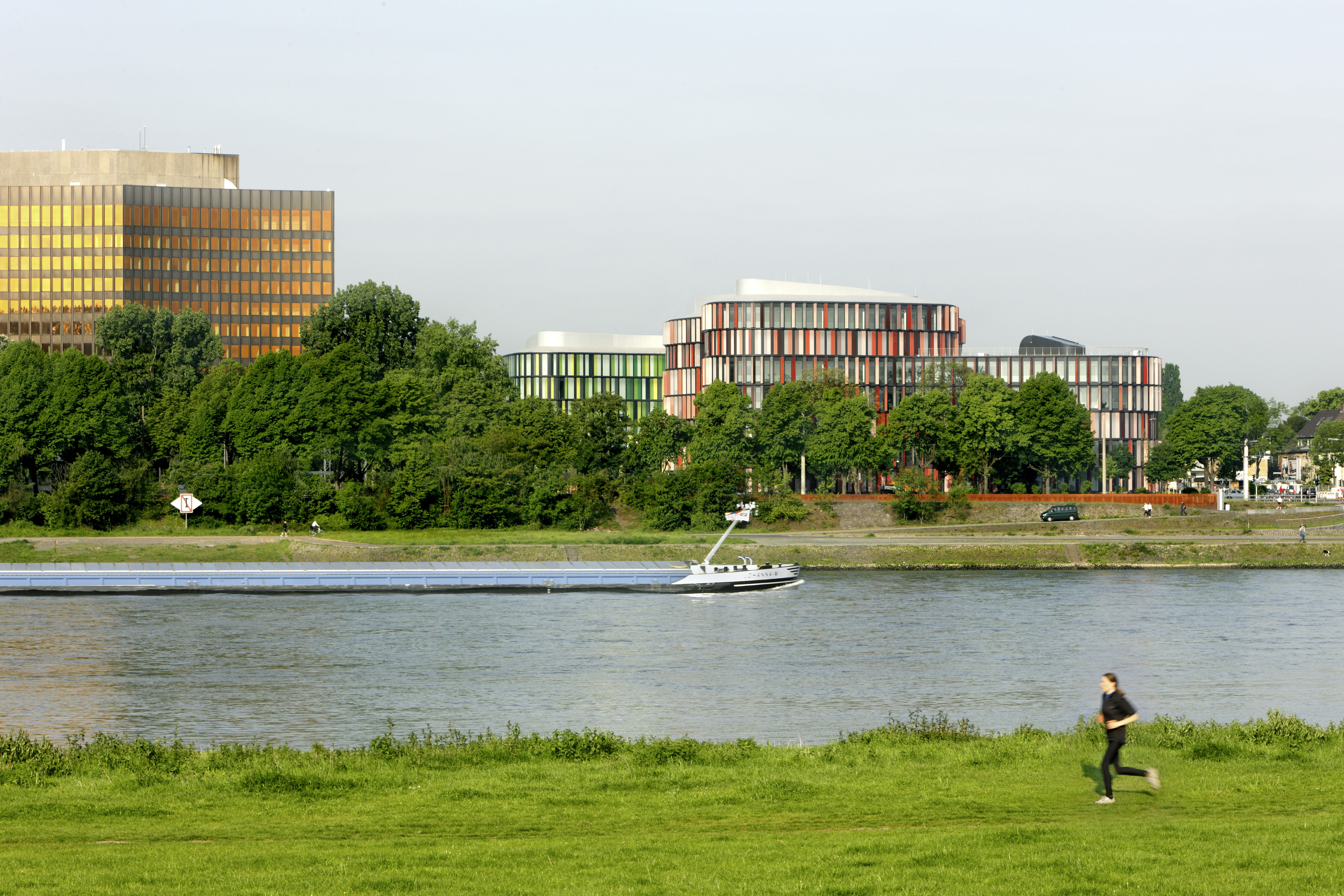 Two colourful six-storey office blocks built around internal courtyards alongside the River Rhine