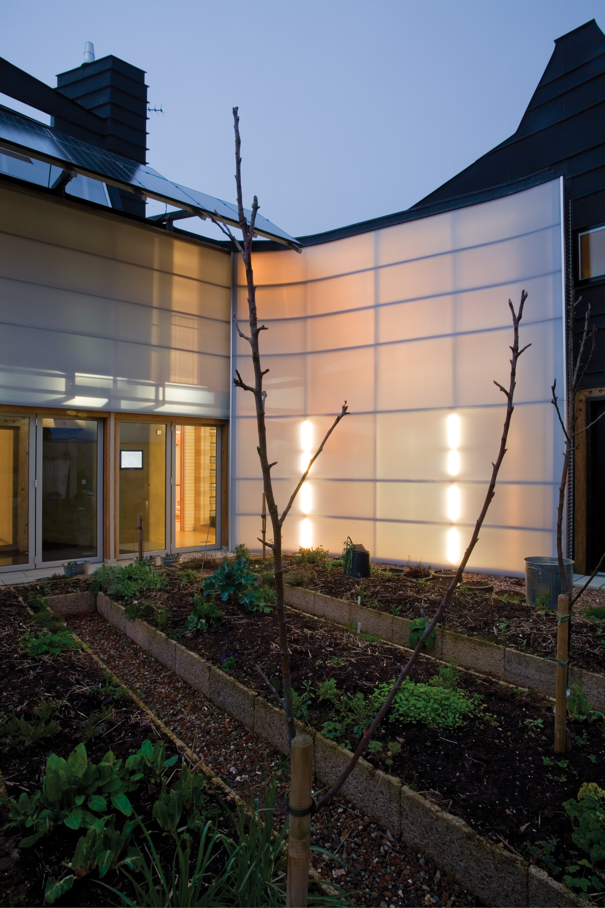 The house has many sustainable elements from its contextual footprint, passive solar design, careful choice of low energy materials, rainwater recycling, water composting, ground source heat pump, solar hot water tank, solar and wind electricity generation and food gardening.