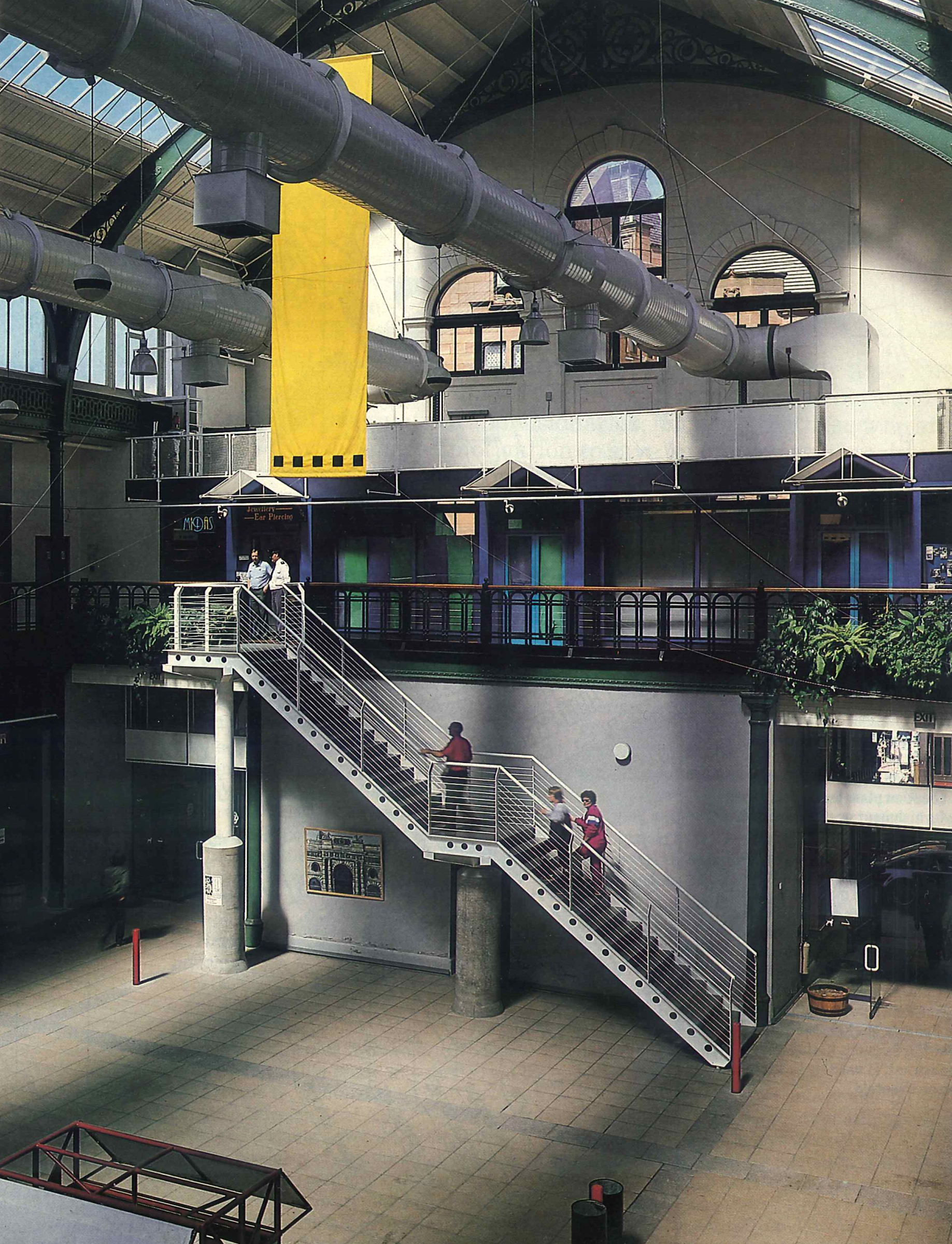 The neo-classical facade on Clyde Street is permeated by way of two arches allowing public access to Merchants' Hall and the shops within. A further two entrances along Bridgegate serve the same purpose. Roof level glazing brings daylight down into the double-height atrium, where the Victorian market atmosphere has been conserved.