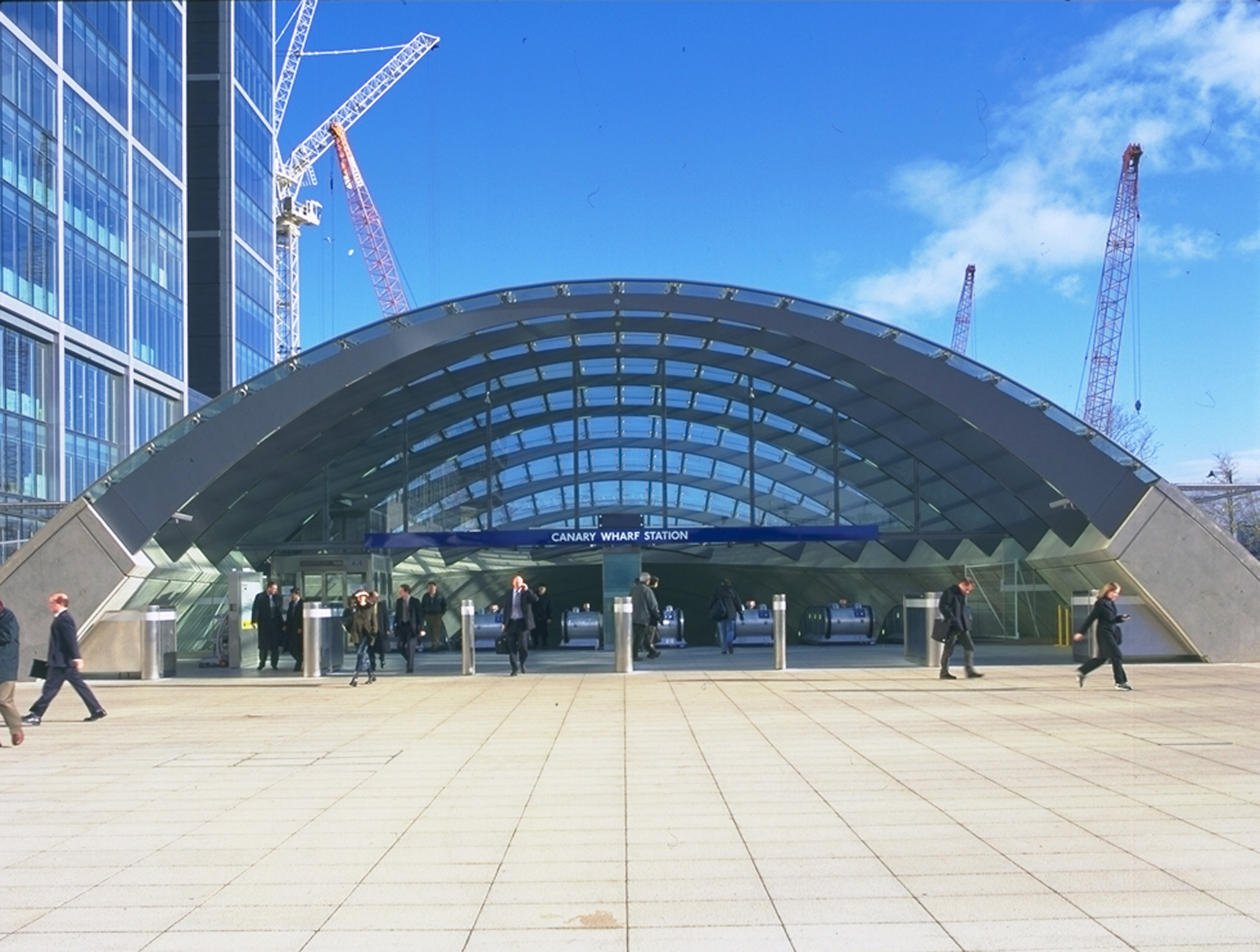 Underground station to serve London's major business district covered by a landscaped park that acts as Canary Wharf's principal public recreation space
