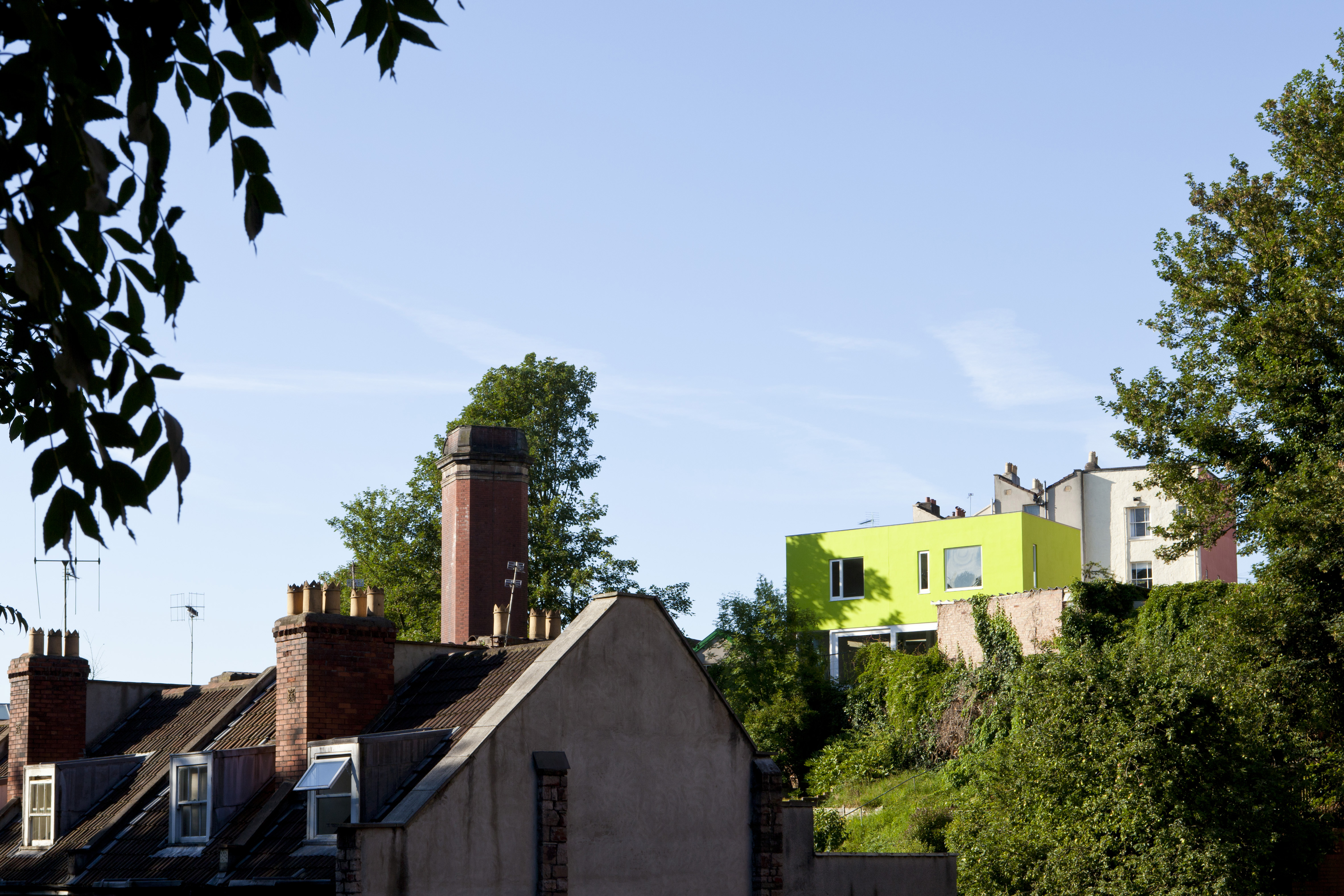 A single storey garden wall traces the site’s boundary, enclosing an L-shaped garden that frames views to north and east. Built in the south west corner the bright green house rises up from behind the wall extending Bristol’s tradition of brightly coloured terraces.