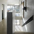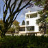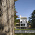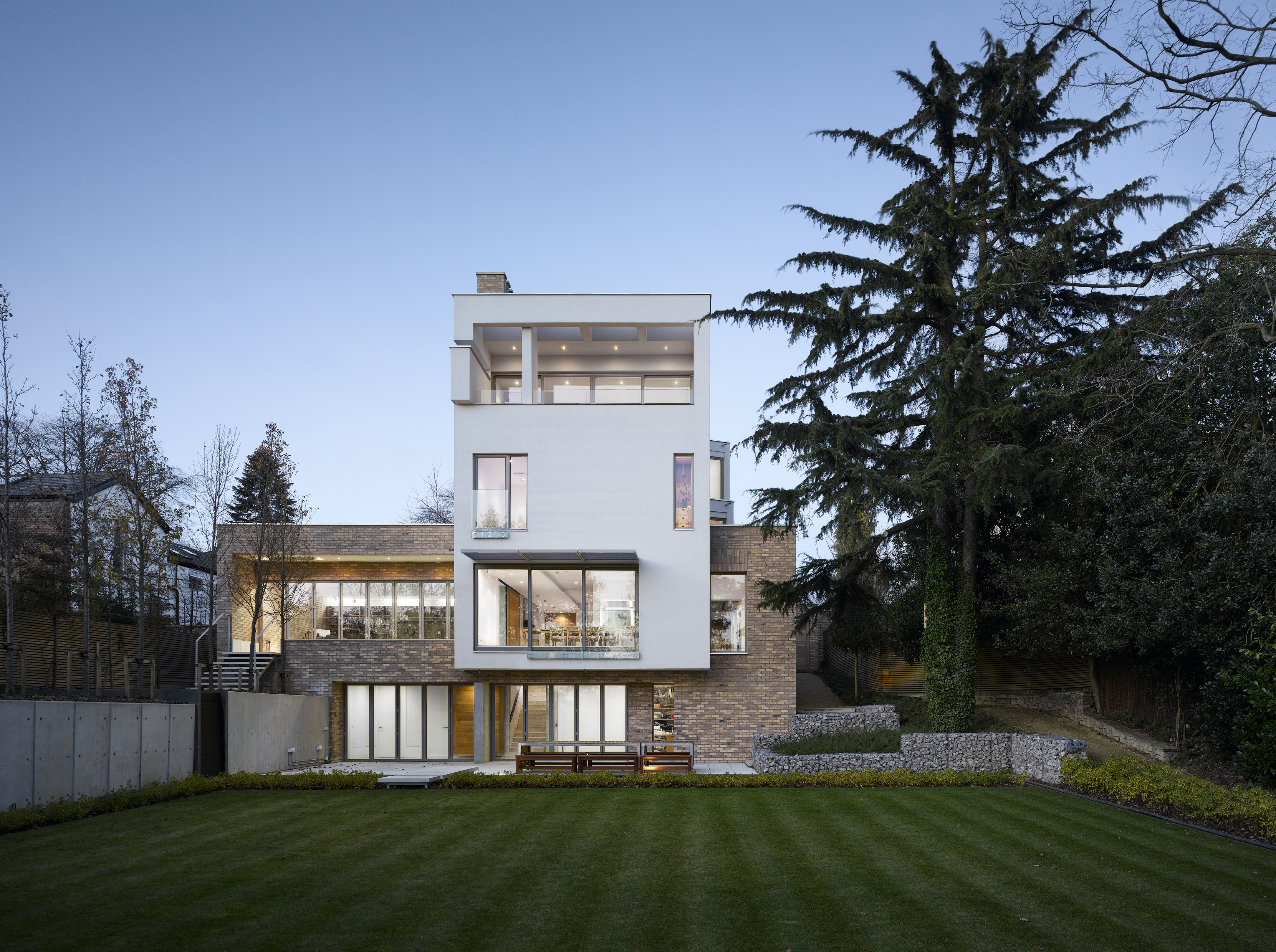 The lower two floors are contained within a brick plinth volume, which occupies almost the full width of the site. Facilities on the lower ground floor include a sauna and shower room, gym, wine store and media room. The ground floor houses the kitchen, living and dining areas as well as a guest suite and a garage.