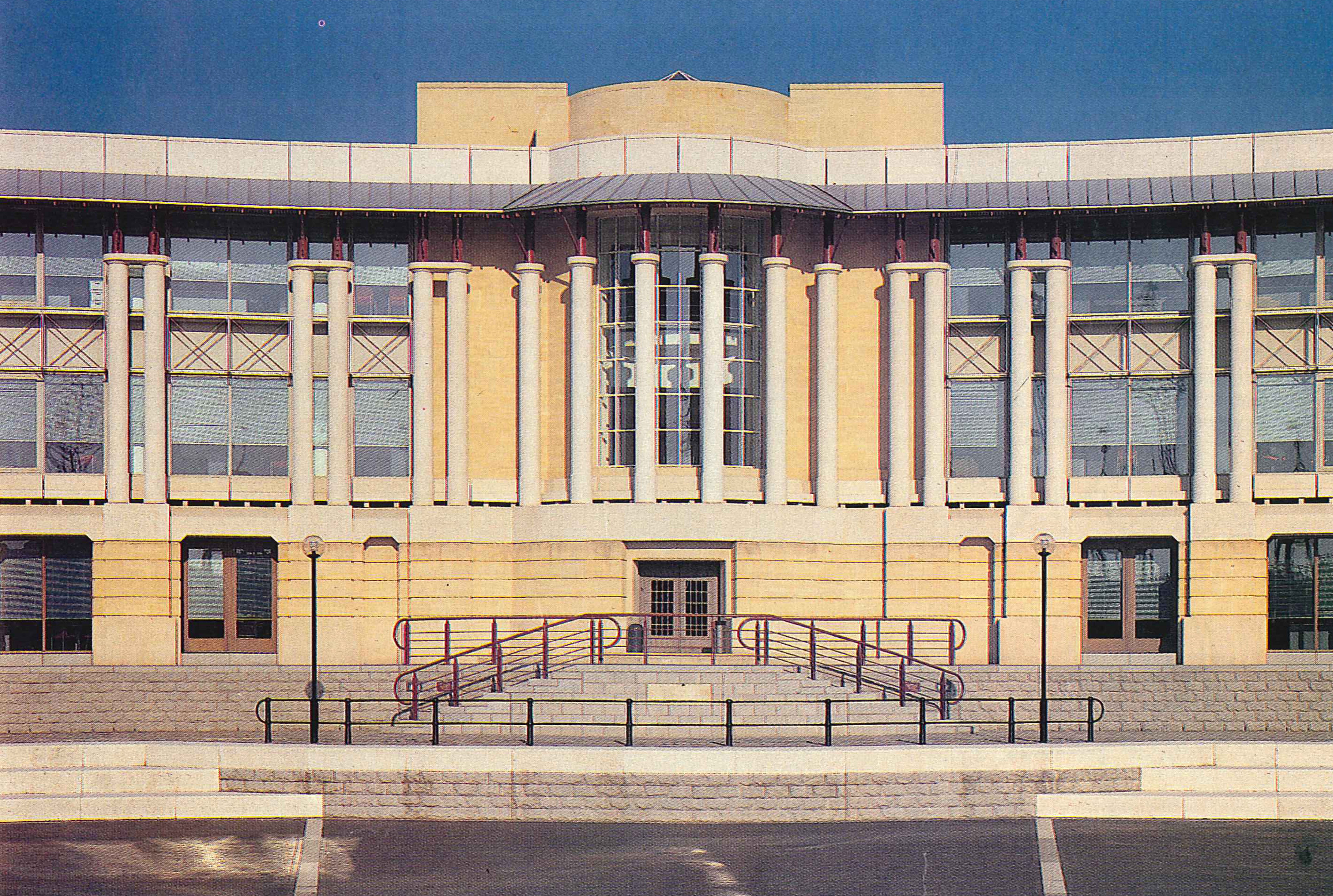 The office has an applied abstract classical facade. A rusticated stone base is surmounted by a row of paired columns sharing a single capital, supporting a deep cornice of open steel and timber framework.