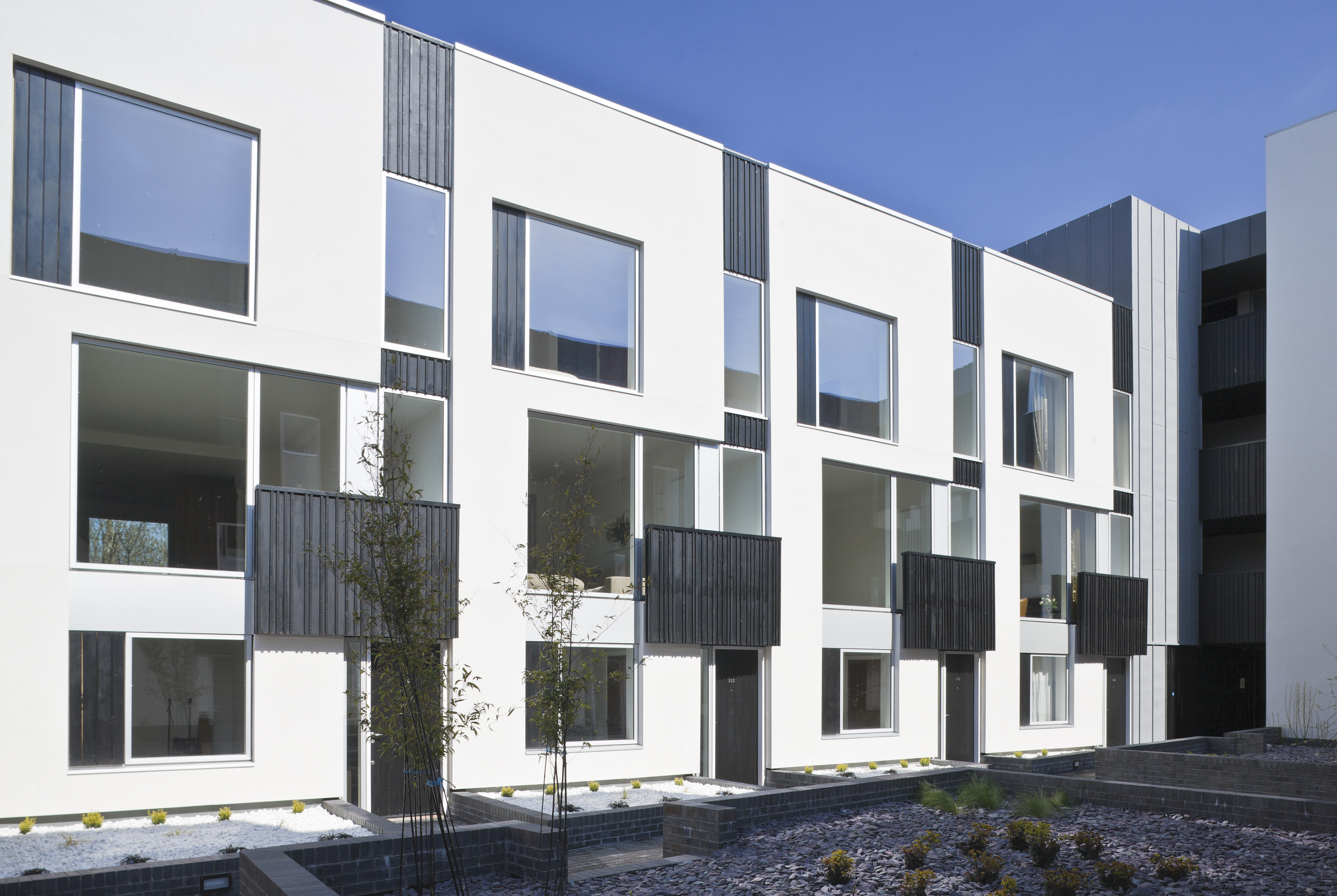 The internal arrangements of the two blocks of houses are configured to maximise privacy between neighbours with the principal habitable rooms of the easterly block facing the staircases and ancillary accommodation to the rear across the courtyard.