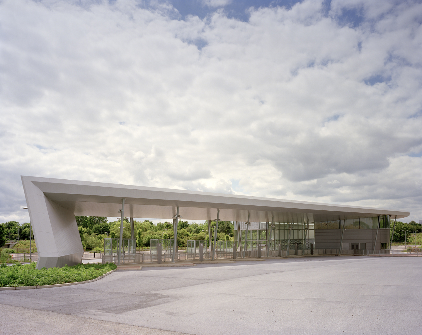 The spine connects the building's two main entrances and is highlighted by a glazed roof light running the length of the building. The building contains an indoor heated waiting area with customer information screens, a café, shop and ticket office.