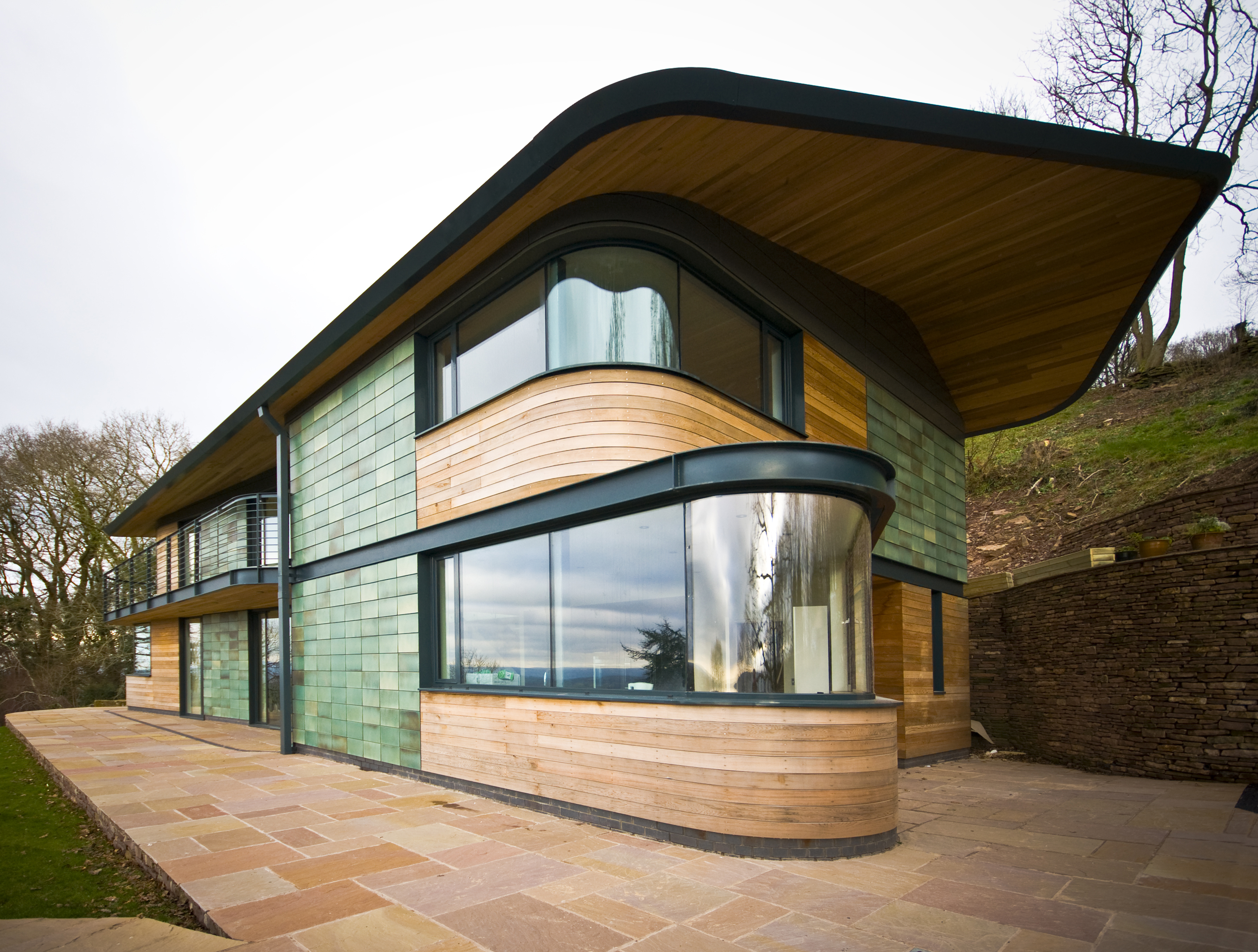 The external façade is clad with oxidised copper-coated ceramic tiles along with horizontal cedar boarding that blends into the hues of the hillside. The timber is intended to weather over time to a silver tone that compliments the green copper tiles.