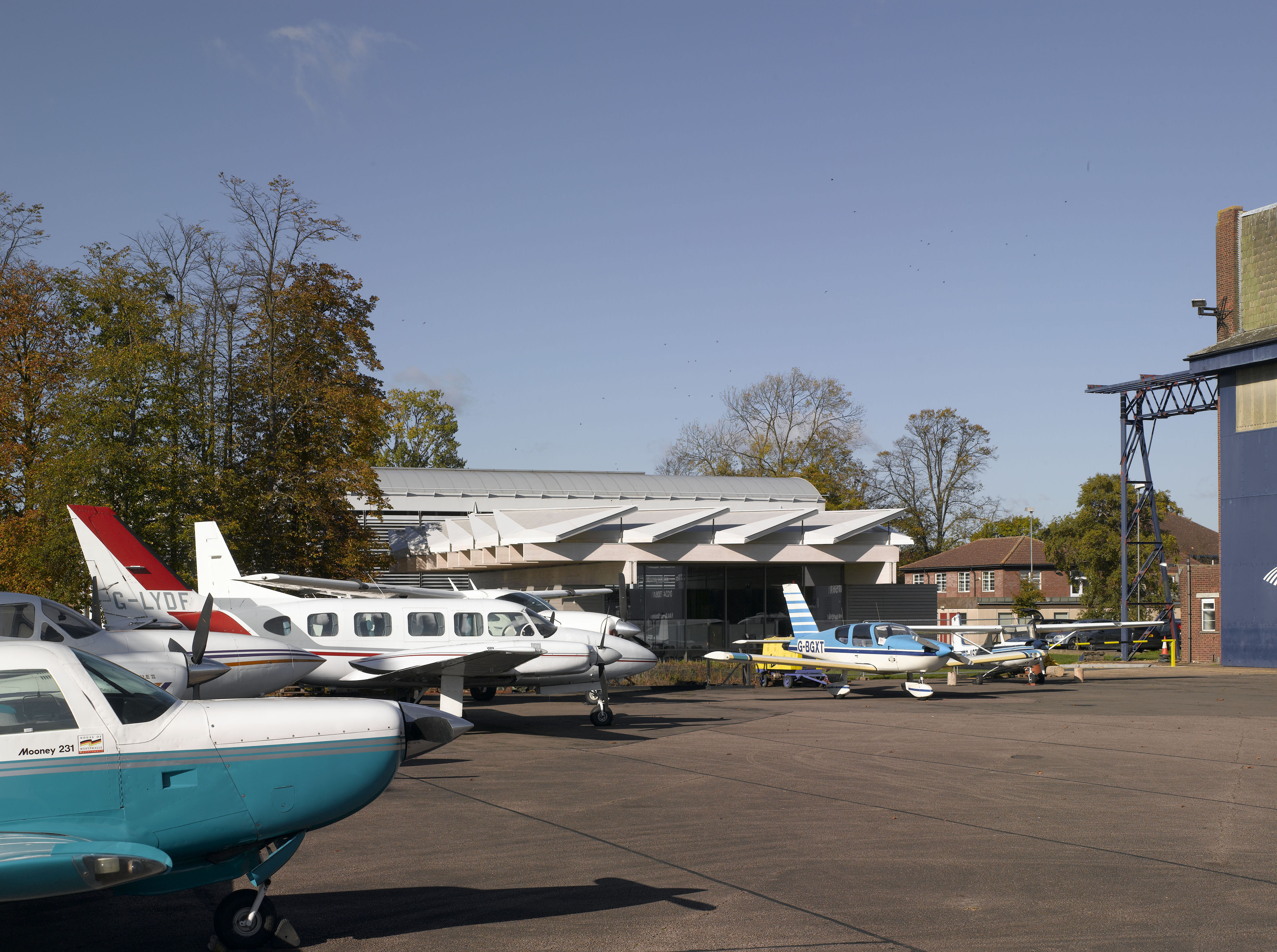 The building is located near the campus, directly adjacent to a functioning airport. It sits beside Foster + Partners Cranfield Library, which has a barrel-vaulted form facing an open square, aircraft hangars flank the rest of the square.