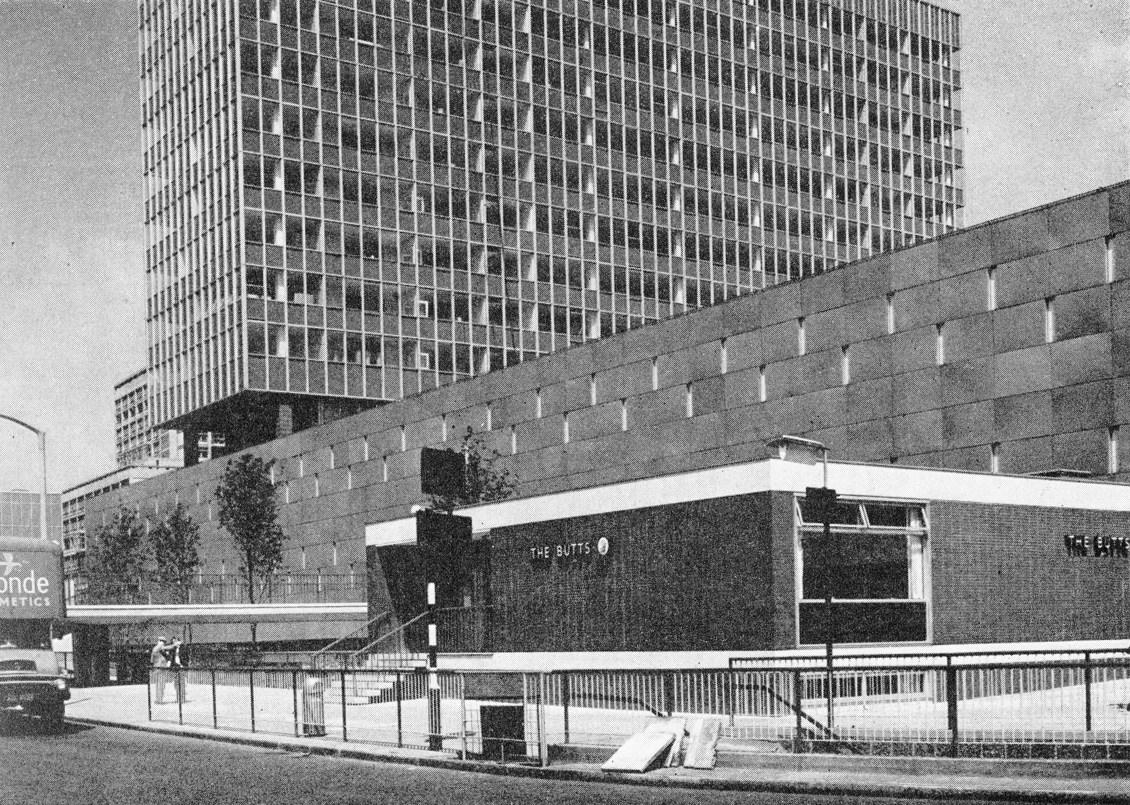 At the ground floor level, sunk below the pavement level, the shops open onto the road sides as well as to the internal passage. The outward setting is limited by a pedestrian terrace with access down ramps or steps from the pavement level or directly from underground facilities.