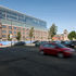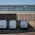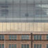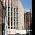 The rear external brick wall extends over the entire building. On the east side, a set-back, gold-tinted glazed attic block manages the transition from low front to high back. To the west, the strong forms of the three splayed office towers are faced with a gridded pattern of light pink Danish brick piers and precast concrete slabs.