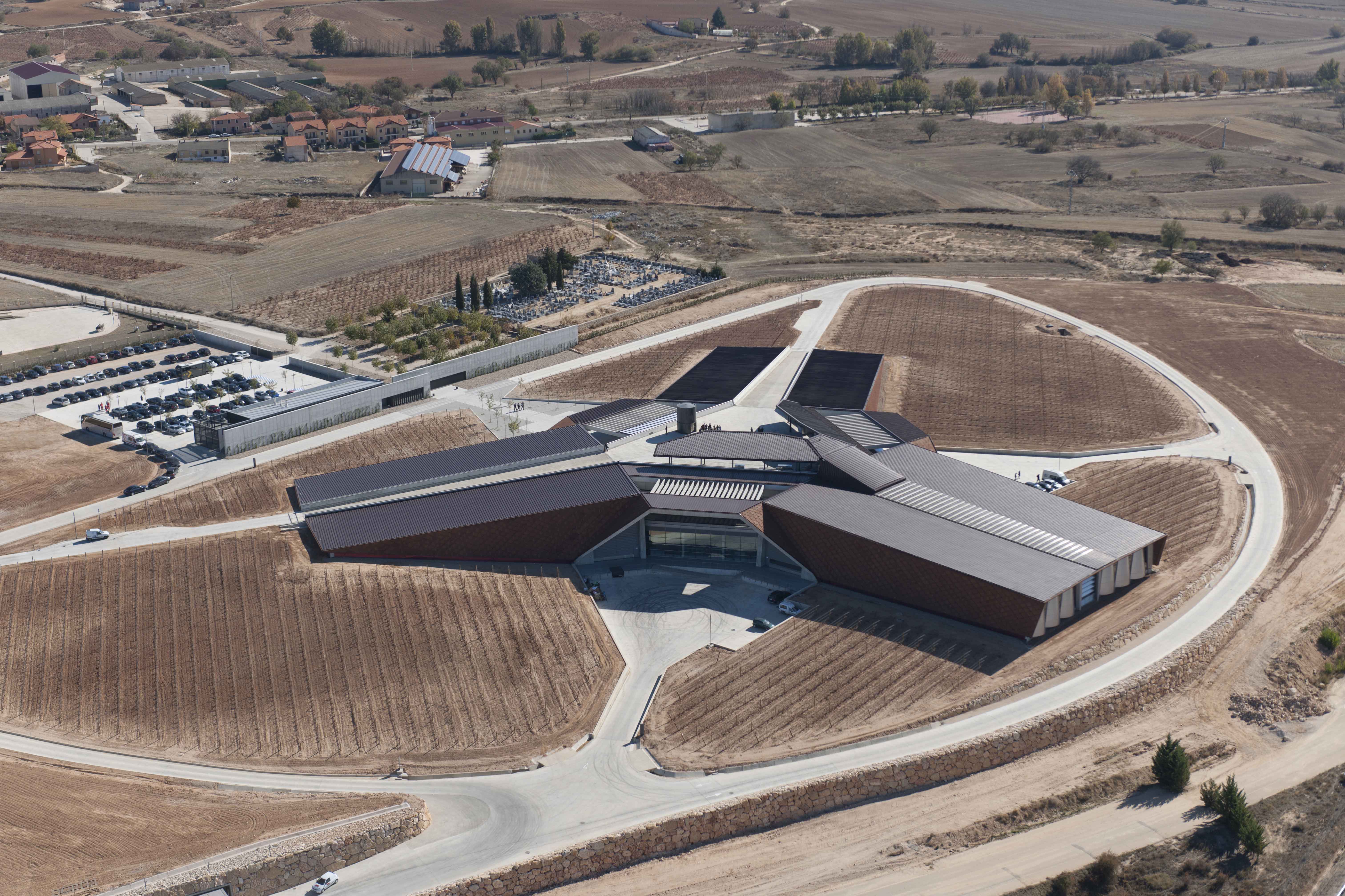 The roof canopy shades the glazed atria and exposed vats and incorporates photovoltaics. The concrete structure is clad in Corten steel shingles, which complement the tones of the vineyards.