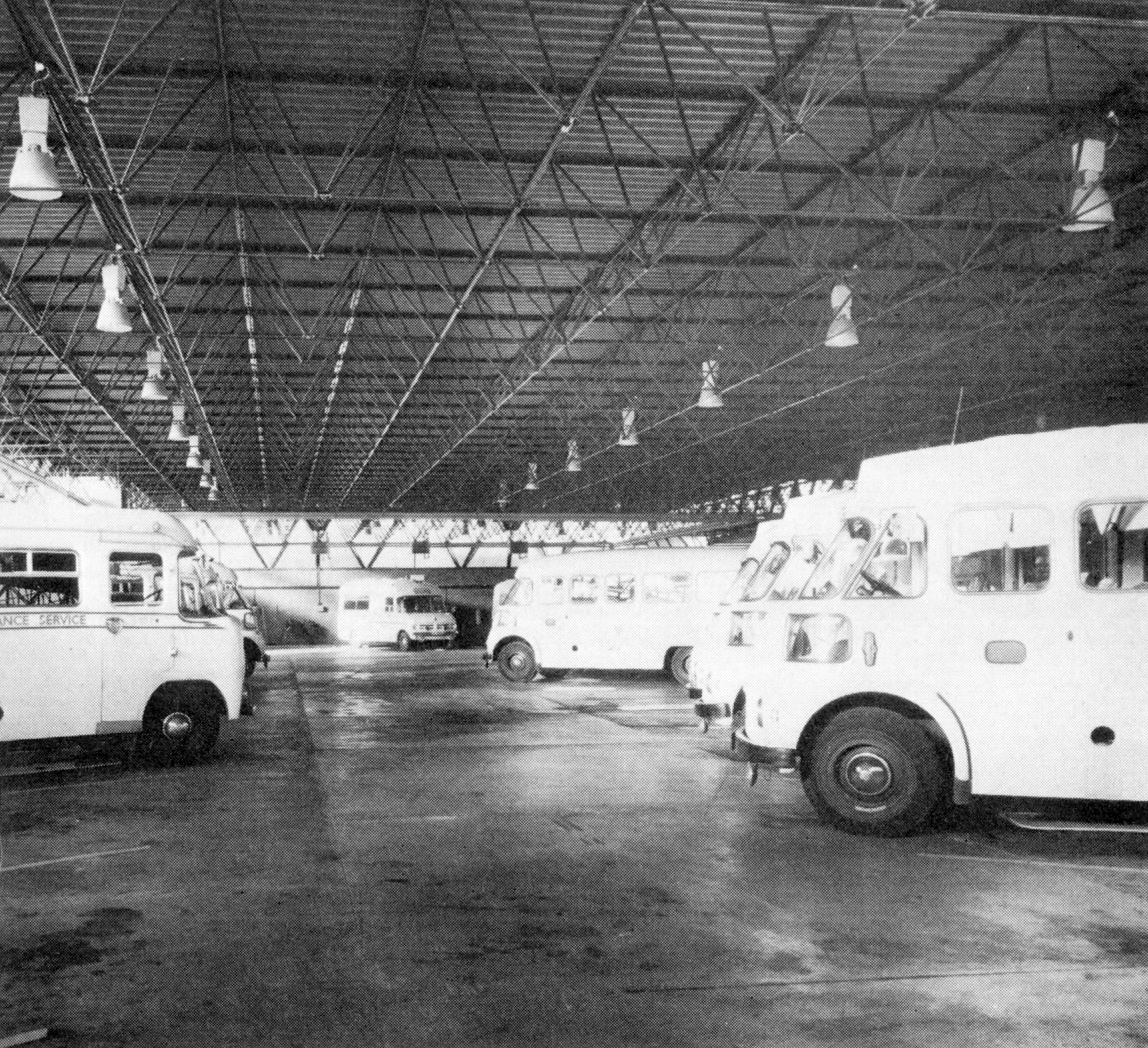 Interior of ambulance garage with spaceframe roof