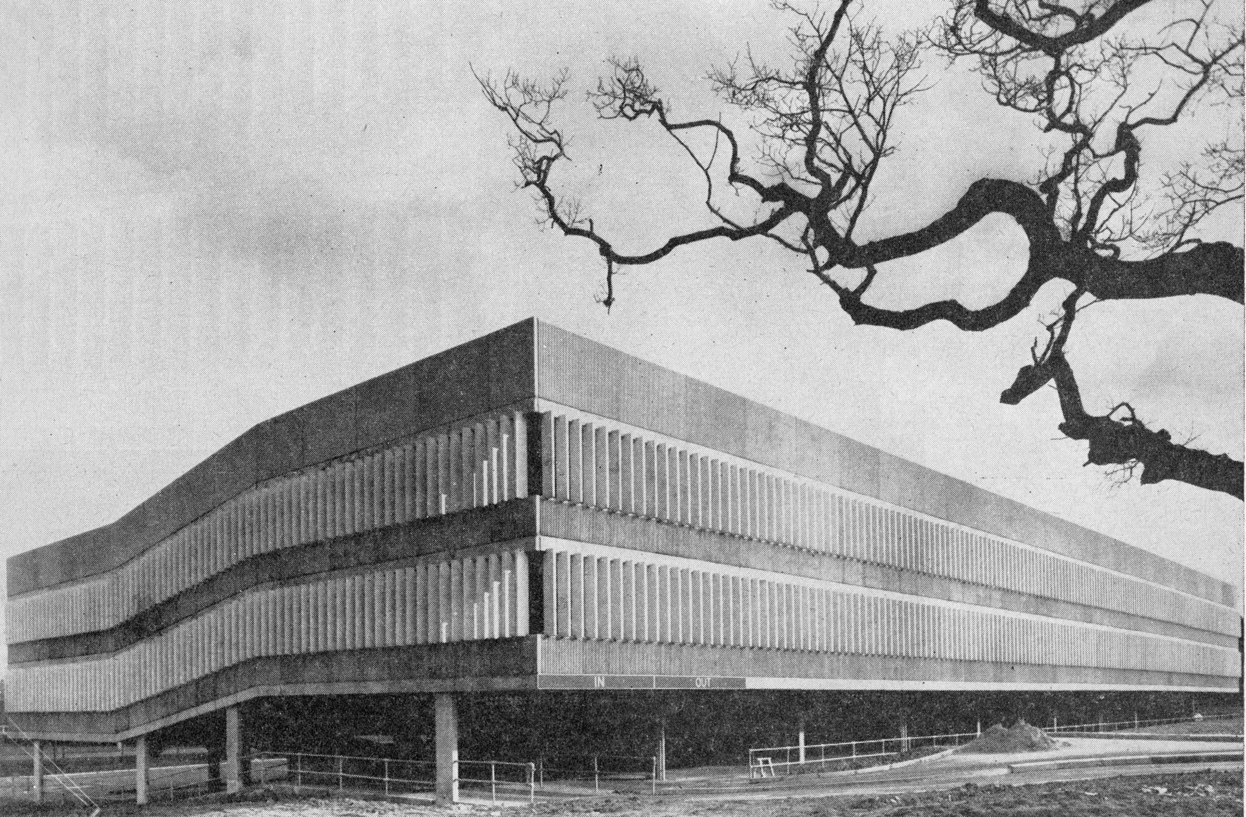 Split-storey car park on a sloping site, serving an adjacent shopping centre
