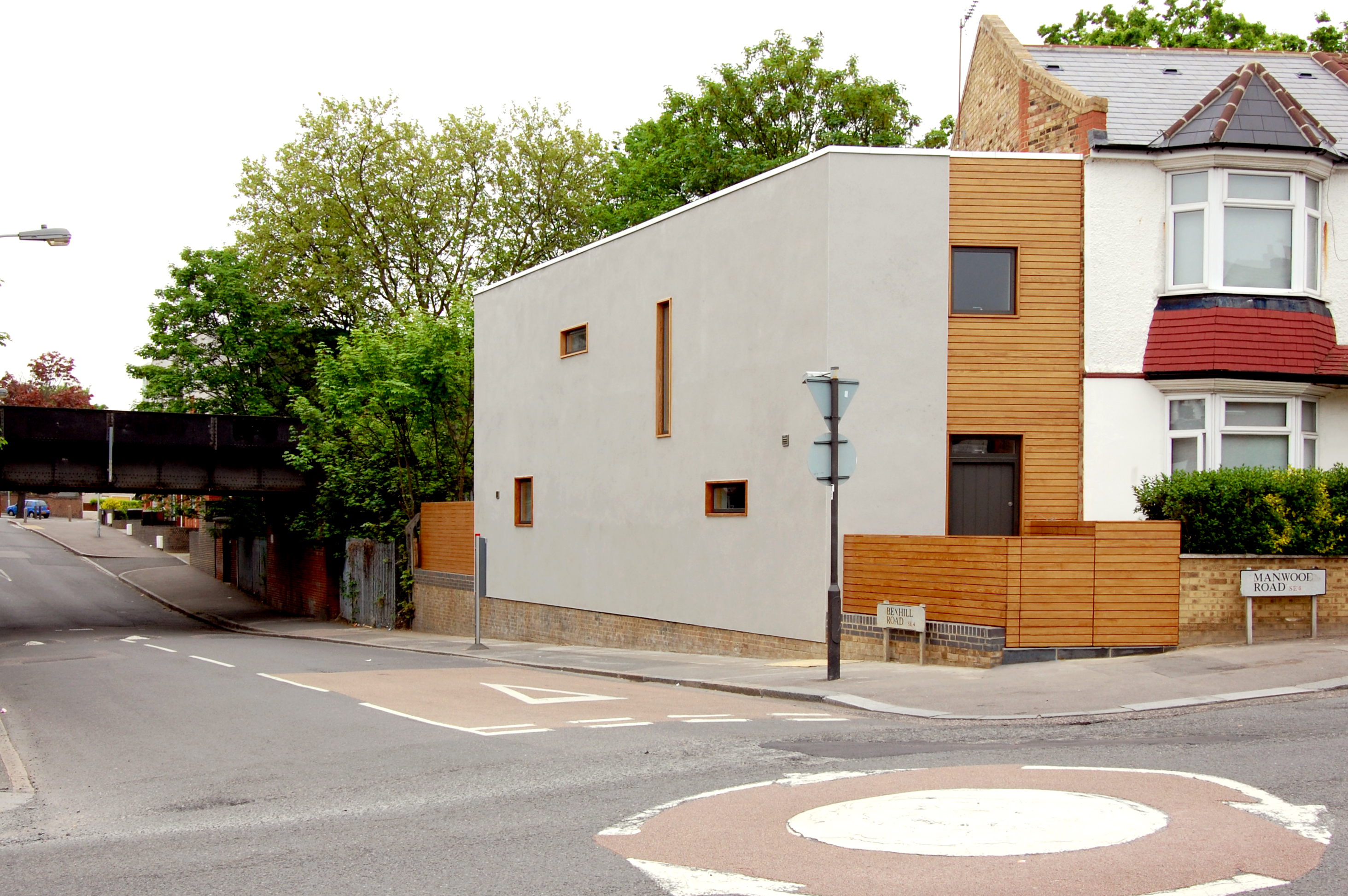 Between these two walls, an infill of timber and glass forms an entrance to the front and frames two large ground floor windows to the rear, focusing views out to the two garden spaces beyond.