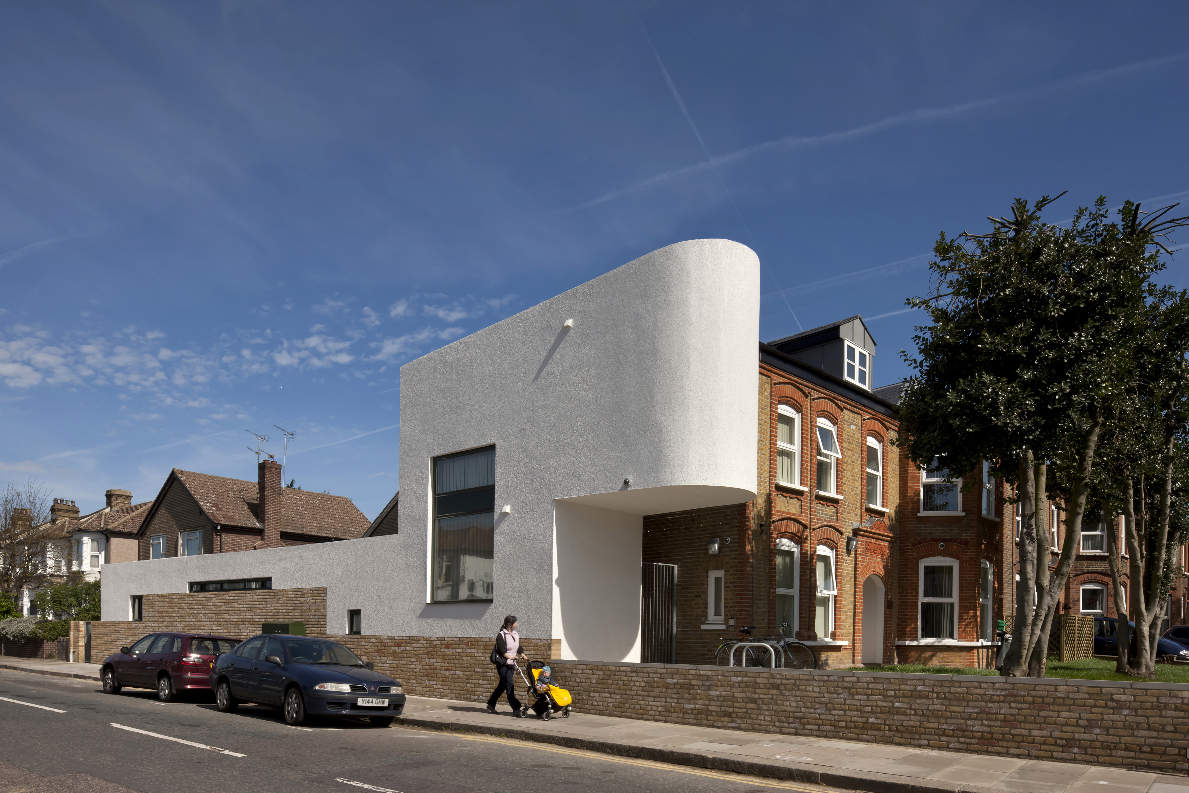 The hostel provides homeless people accommodation and support for stays of between three to nine months. Rather than concealing the hostel a white rendered cassette with a tapered, cantilevered radius end, which contains an ensuite unit, projects beyond the original residence.