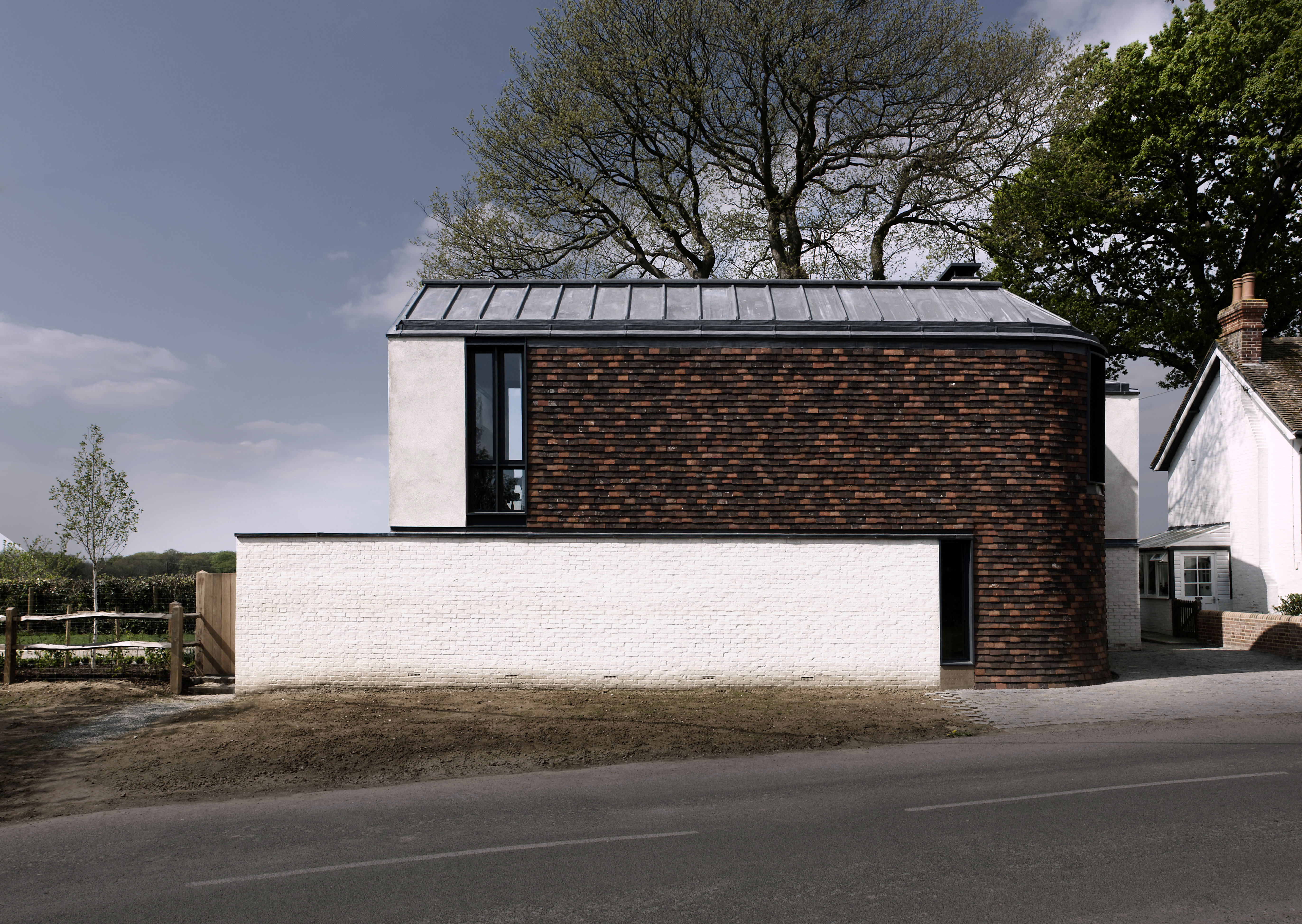 Contemporary house in Sussex built on a tight village site with two distinct halves split by a central axis