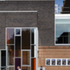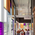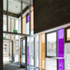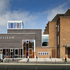 The extension building features contrasting grey brick facades to the original building and large areas of coloured glazing.