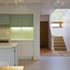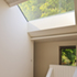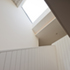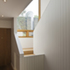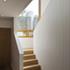 The south-facing façade incorporates horizontal oak louvres to ensure privacy for the bathroom and to reduce solar gain. The rear façade uses vertical oak elements, while the front incorporates horizontal oak elements. The pattern of vertical timber is then echoed internally with white tongue-and-groove boarding that runs through the kitchen, roof light, staircase, landing and joinery.