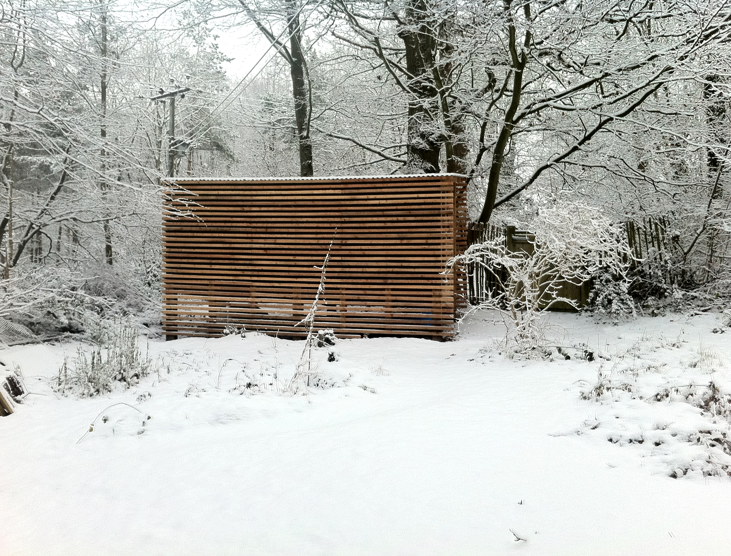 It is sized to store one year’s fuel, and is sited to capture prevailing south westerly wind, and designed to encourage air flow through the drying timber, yet keep rain out. It is a home grown larch frame constructed on site and made entirely with dry joints with no foundations.