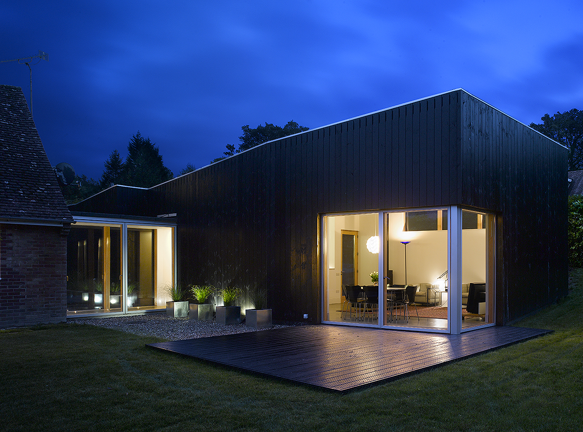 The whole new building was based on a barn like structure. It is one simple volume made from a timber balloon frame, and clad in timber. This idea is emphasised by the use of black vertical boarding, picking up on a common agricultural aesthetic in the area. This cladding was cheap enough to allow us to overclad the garage and thus make it feel part of the new space.