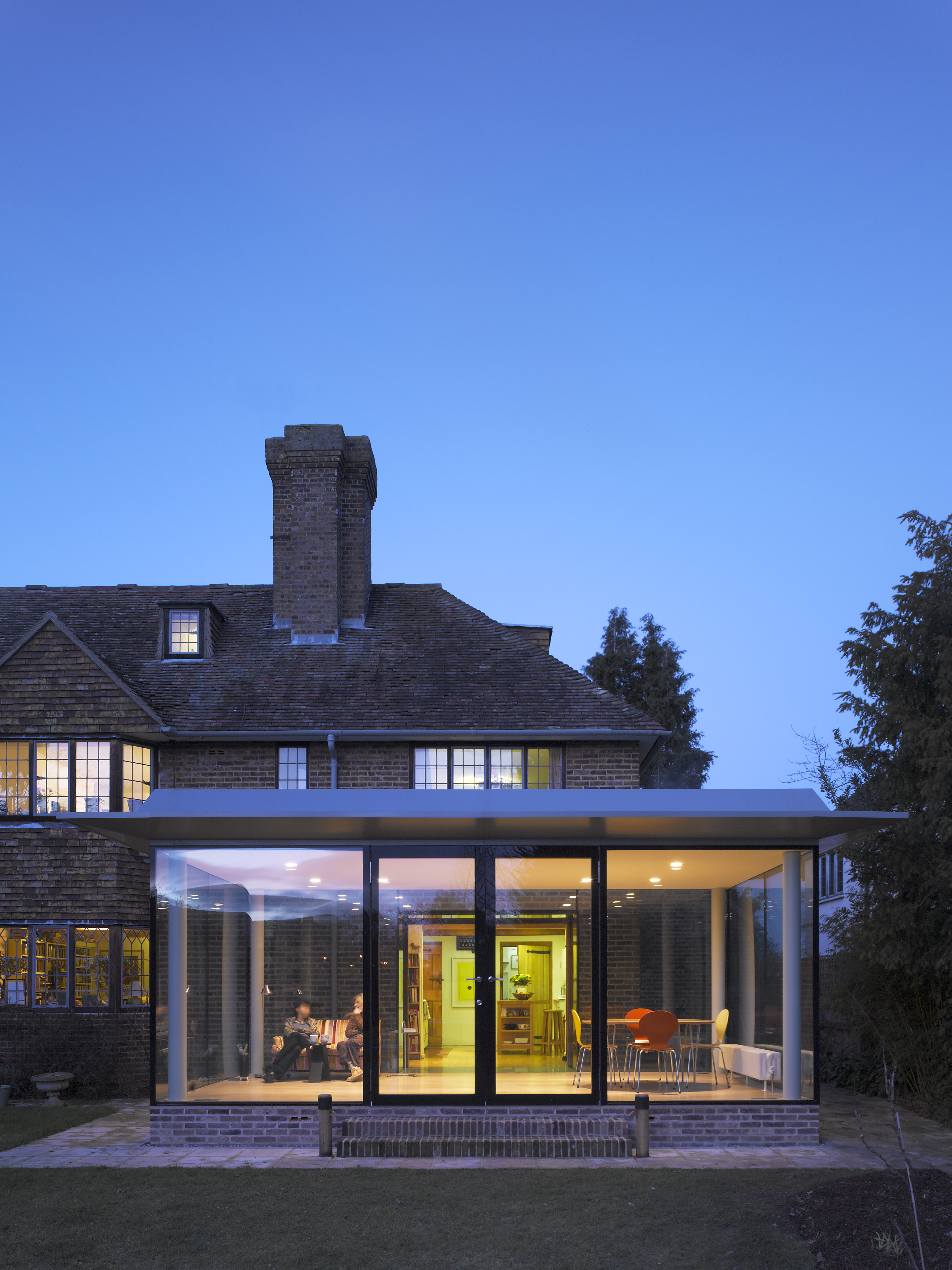 A glazed pavilion extending an Arts and Crafts house in Cambridgeshire