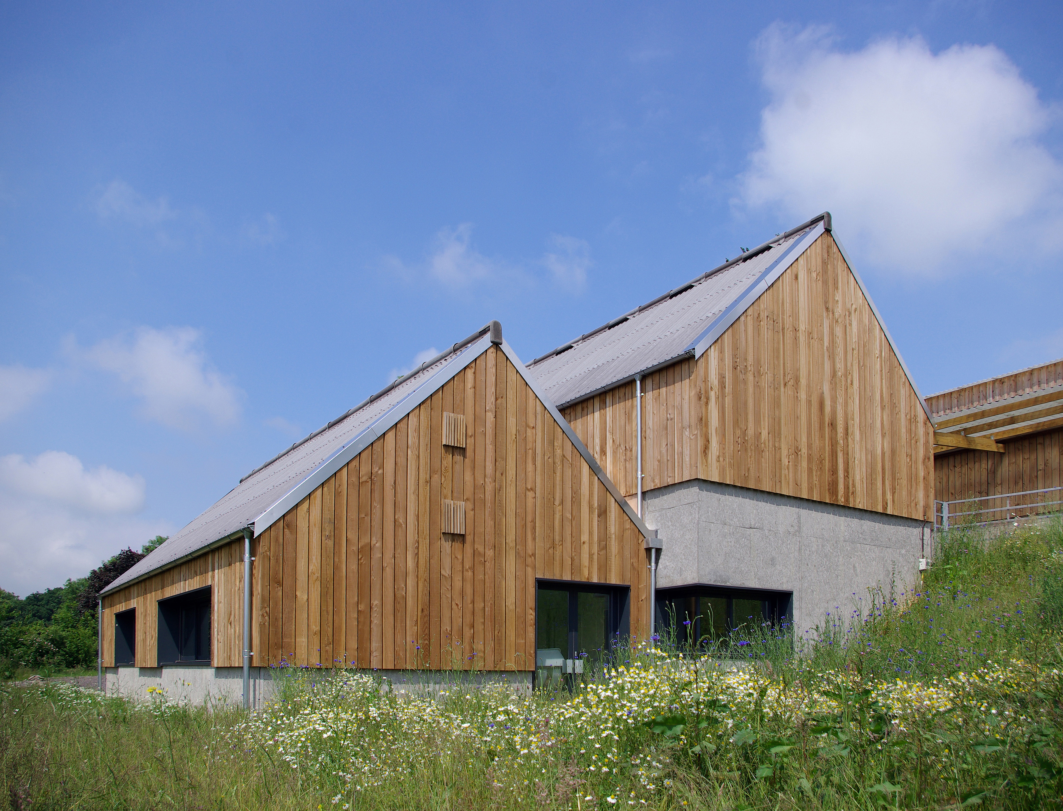 The three elements each have an insitu concrete plinth marked with sterling board shuttering, over this vertical douglas fir cladding, in varying profiles, allows air and light into the buildings. The units each terminate with a simple gabled pitch roof in profiled fibre cement cladding.