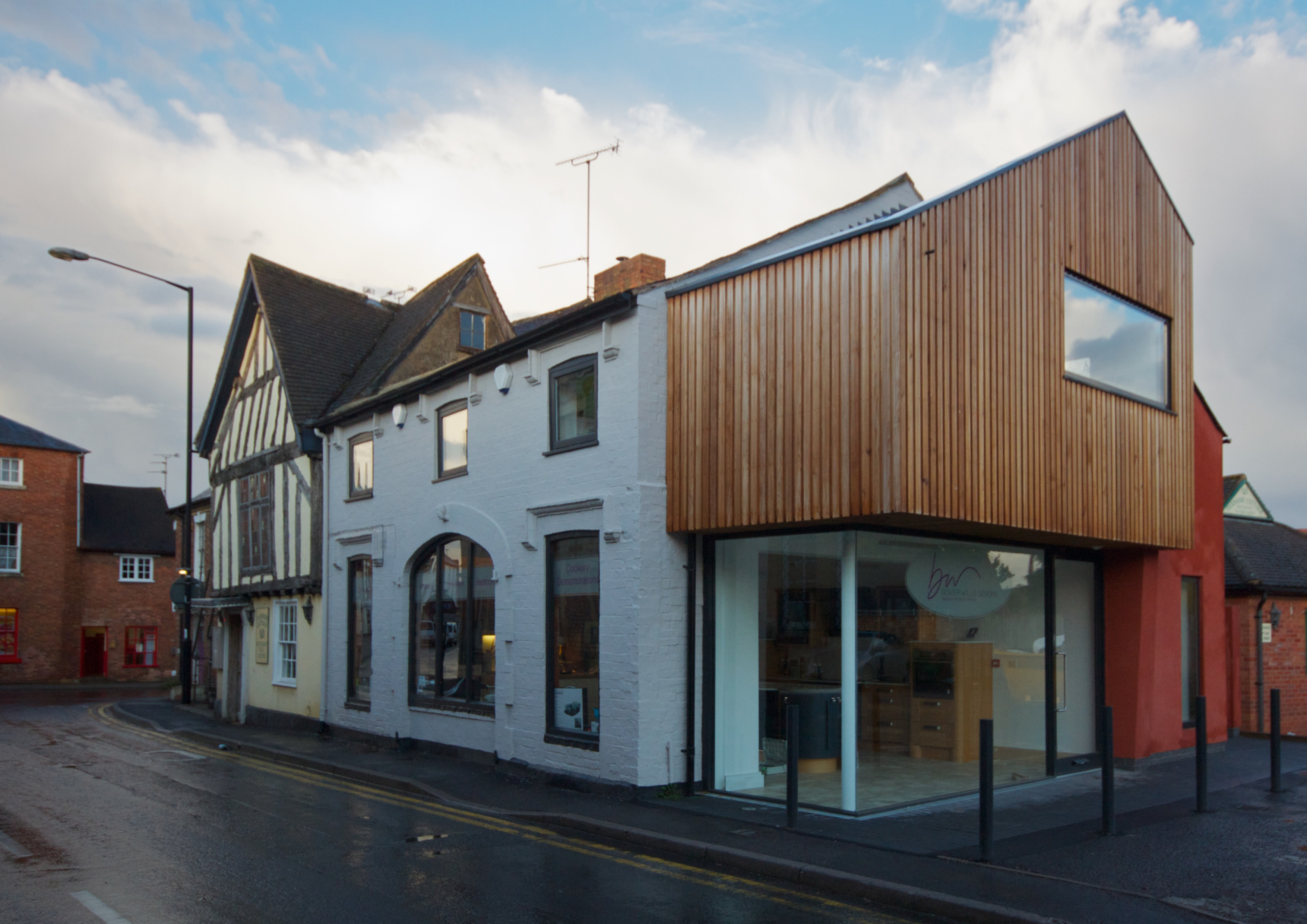The form of the extension follows the traditional pitch of the existing building, although this is broken down into an asymmetrical composition. The dominant, cedar board on board clad first floor element projects over the transparent ground floor shop front. These are linked with a solid rendered block forming the entrance lobby to the office, which buttresses both the ground and first floor elements.