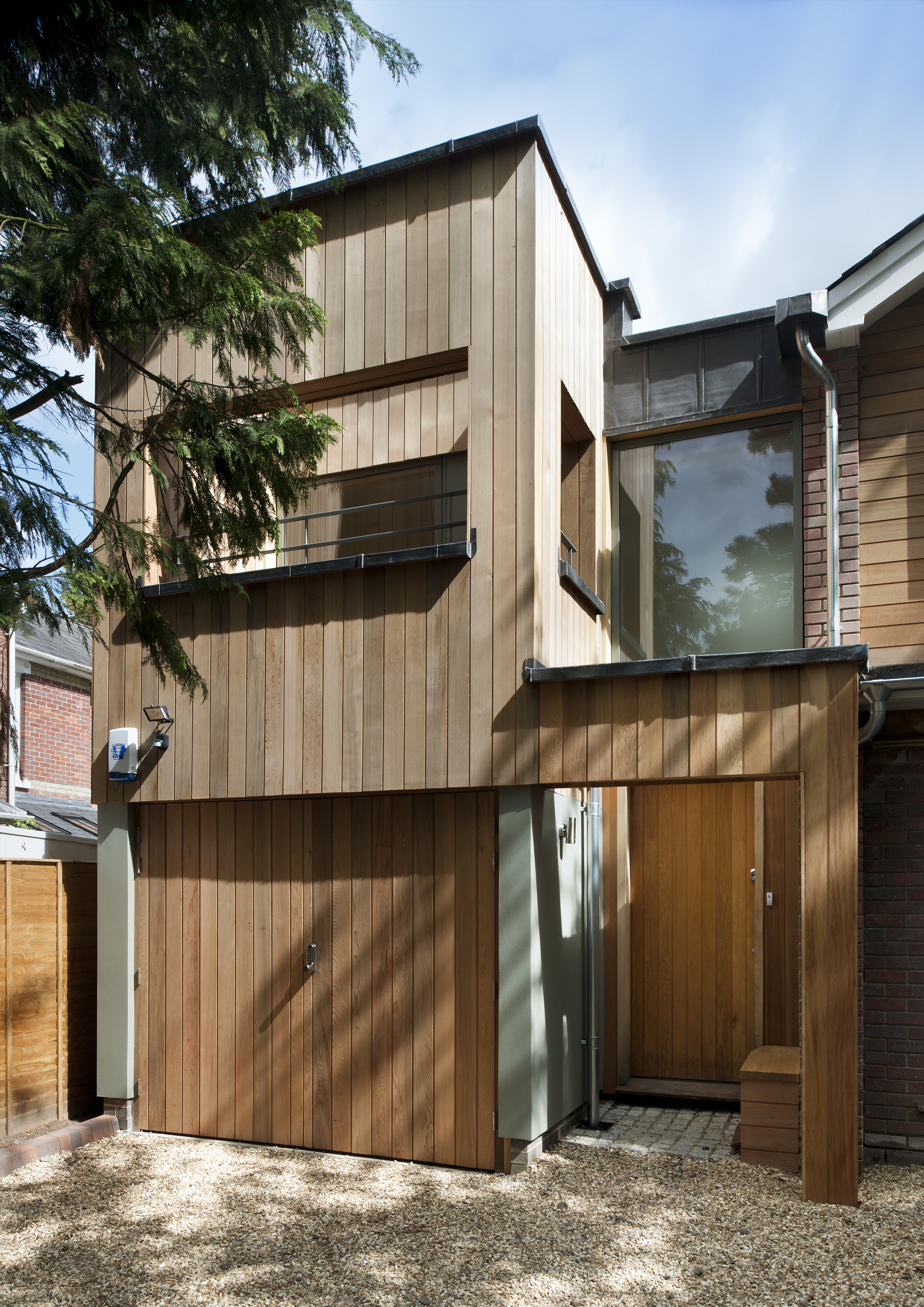 The extension takes the form of a bold contemporary box insertion accommodating additional bedrooms, a playroom, the kitchen and family bathroom. Outside, Western Red Cedar is used to clad the existing structure, helping the house to blend in comfortably to its wooded environment. The timber flooring inside extends outside to form an ipe deck and glazed sliding screens create a seamless transition between inside and out.