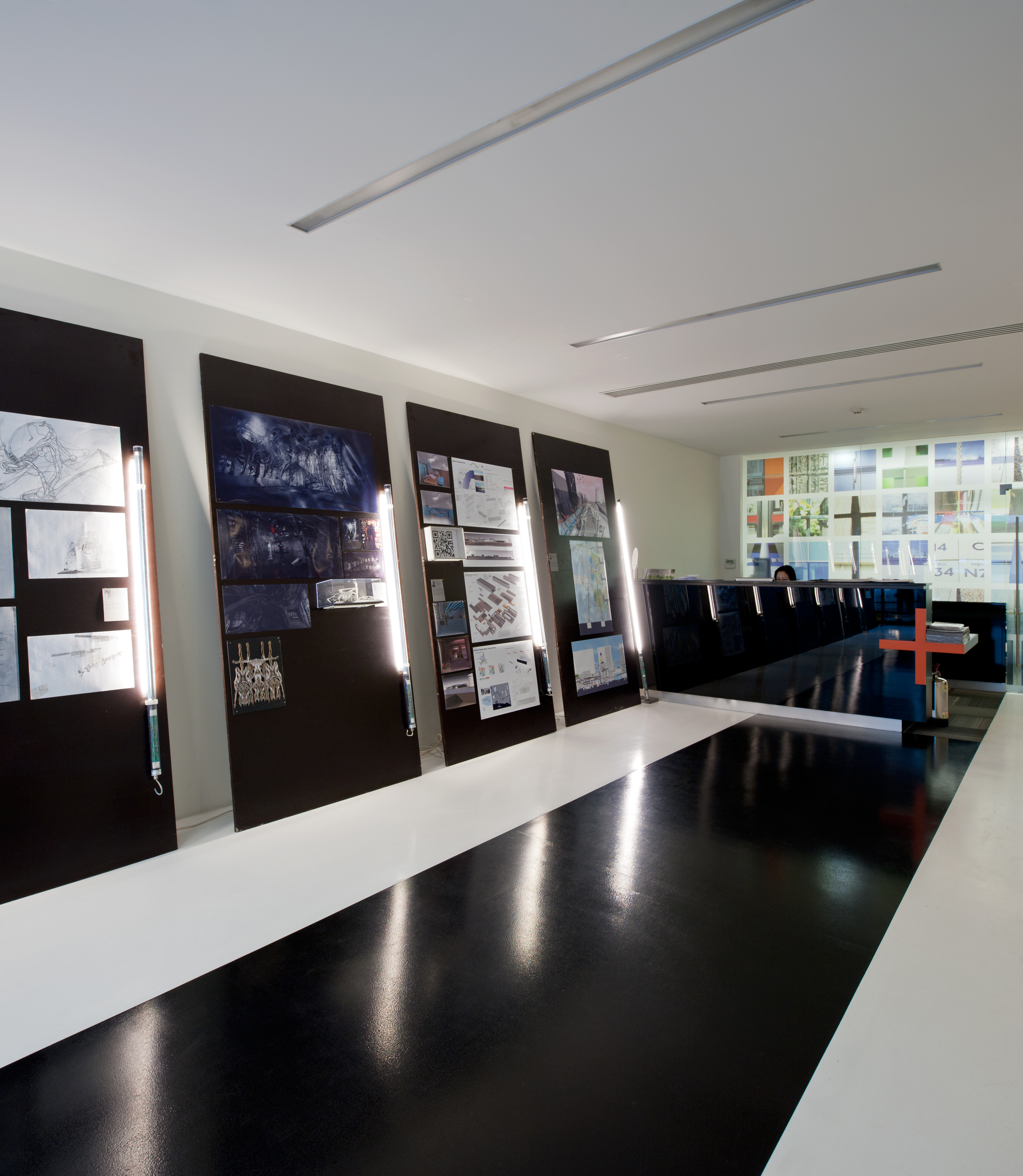 We developed a proposal that used shuttering ply, leant against the walls of the space. The glossy black finish of the industrial material provided a perfect backdrop for the students work. Viabizzunno provided high-spec light fittings free of charge; the combination of materials and lighting elevated the space into a dramatic gallery.