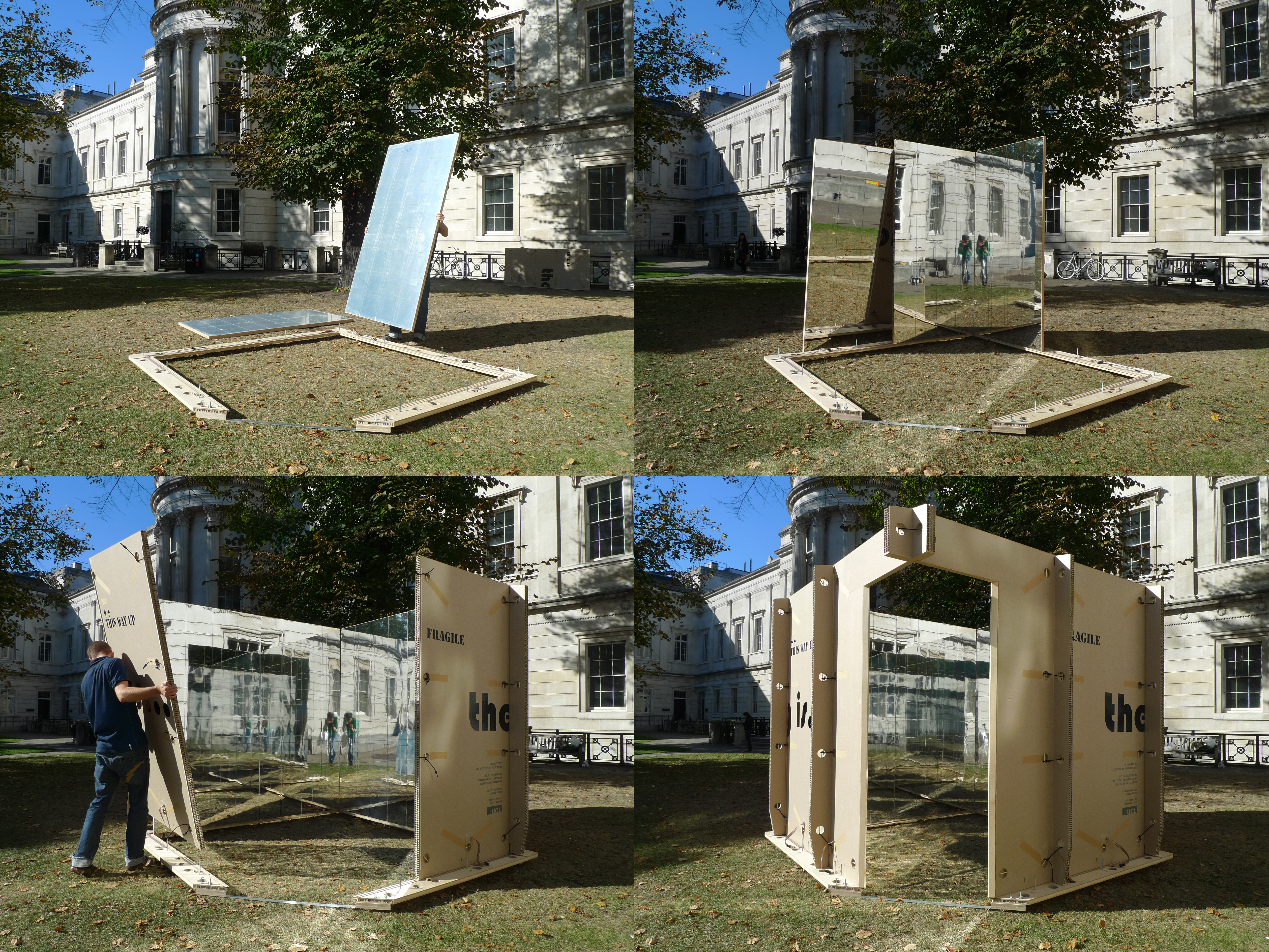 The gallery is made of composite lightweight recycled paper honey-comb panels, which are laminated with a tiled mirror finish on the internal surfaces. The interior creates an illusion much larger than its physical size. The five sided mirror surfaces also allows visitors to see the museum object from all angles within the reflection of the gallery walls. The object in turn is multiplied infinitely within the space.